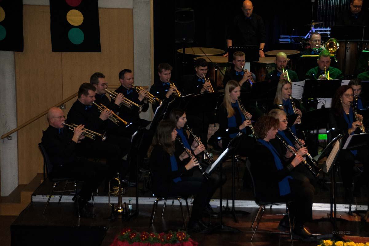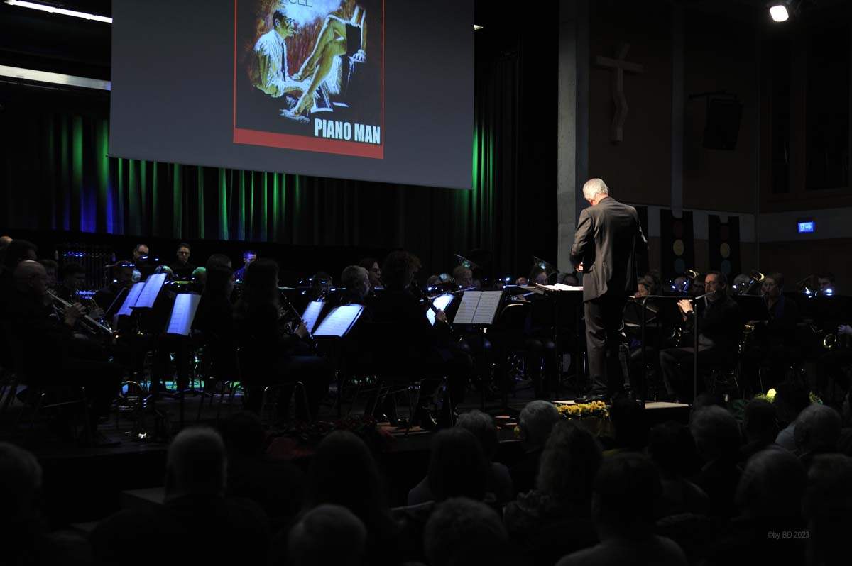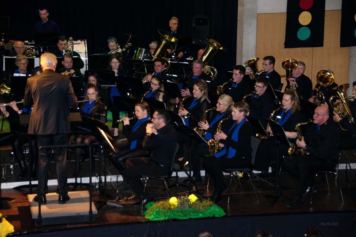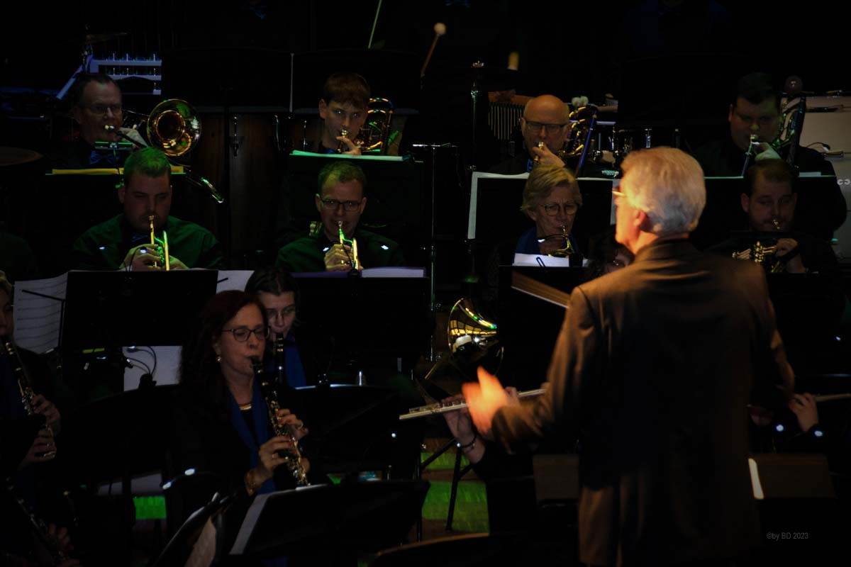 Das Hauptorchester startete den musikalischen Reigen mit einem Marsch des holländischen Komponisten Johan Wichers. Danach ging es, lediglich von einer kurzen Pause unterbrochen, Schlag auf Schlag weiter. Musikalisch ließen die Musikerinnen und Musiker unter der Leitung von Bert Roerdingholder an diesem Abend kaum ein Genre aus. Mit einem Medley von Billy Joel (Just the way you are, Piano Man, She’s always a woman u.a.) zeigten sie bereits zu Beginn, dass sie für die konzertante Blasmusik brennen und dass es ihnen großen Spaß bereitet, endlich wieder vor Publikum auftreten zu können.