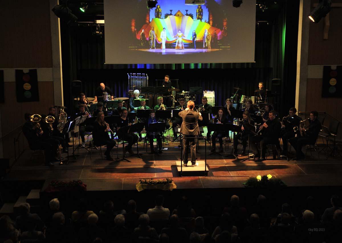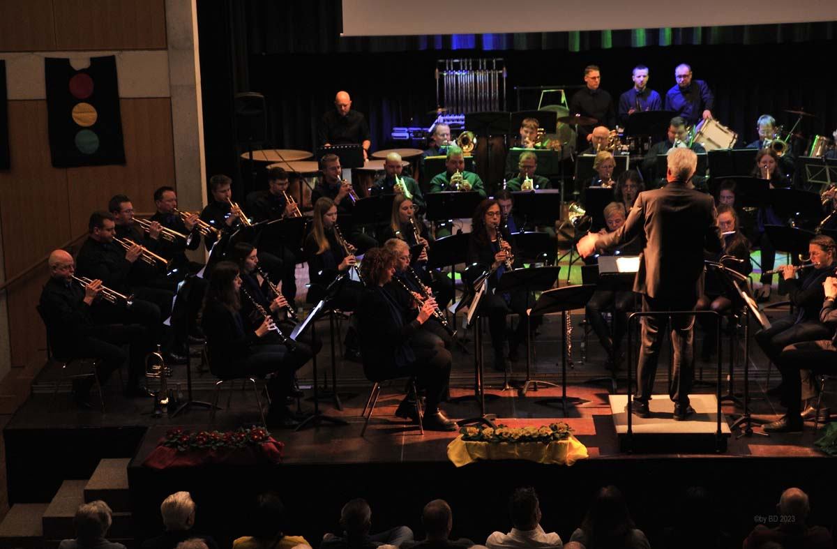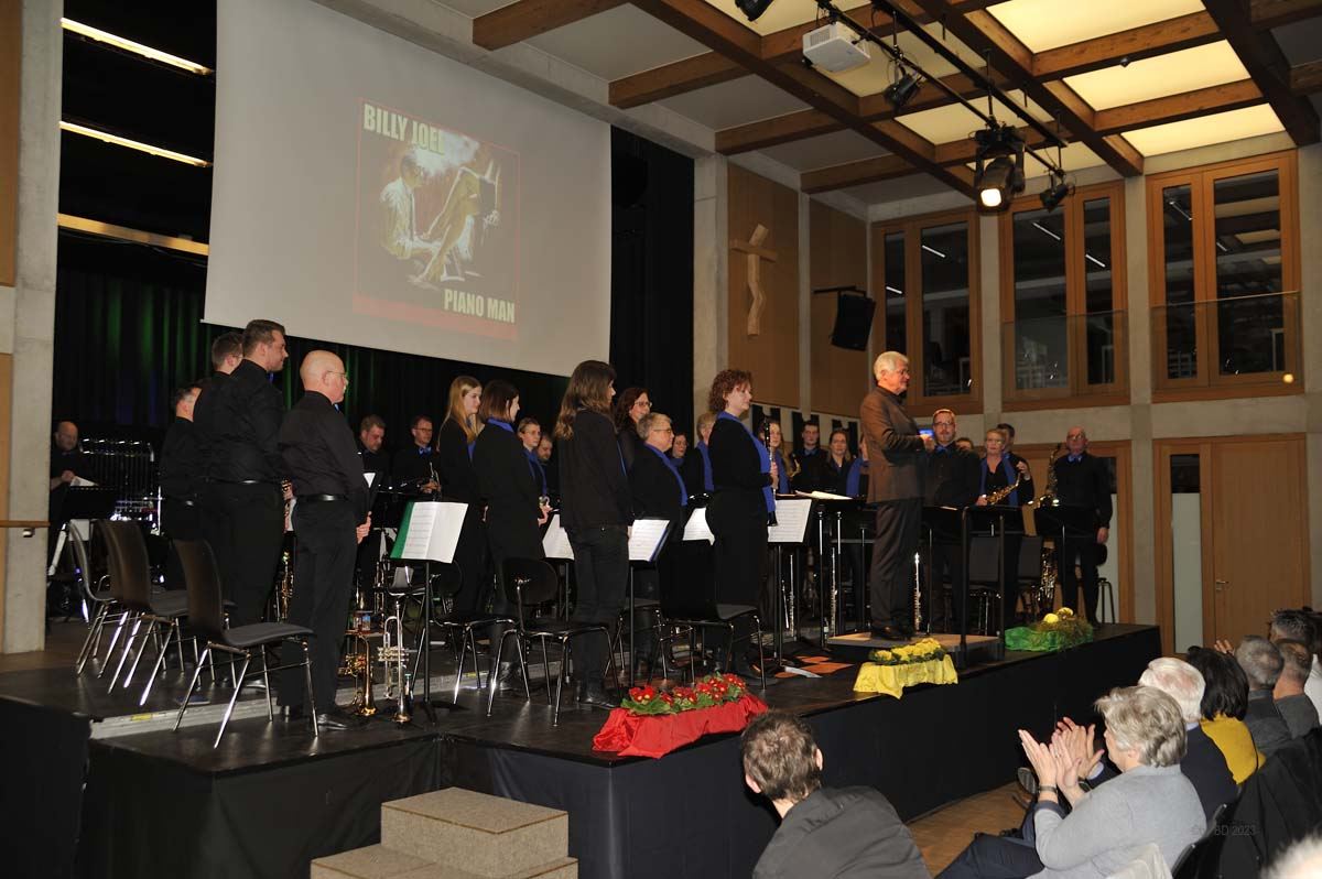 Das Hauptorchester startete den musikalischen Reigen mit einem Marsch des holländischen Komponisten Johan Wichers. Danach ging es, lediglich von einer kurzen Pause unterbrochen, Schlag auf Schlag weiter. Musikalisch ließen die Musikerinnen und Musiker unter der Leitung von Bert Roerdingholder an diesem Abend kaum ein Genre aus. Mit einem Medley von Billy Joel (Just the way you are, Piano Man, She’s always a woman u.a.) zeigten sie bereits zu Beginn, dass sie für die konzertante Blasmusik brennen und dass es ihnen großen Spaß bereitet, endlich wieder vor Publikum auftreten zu können.