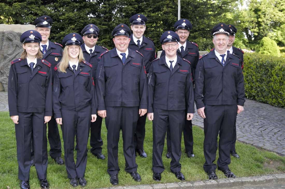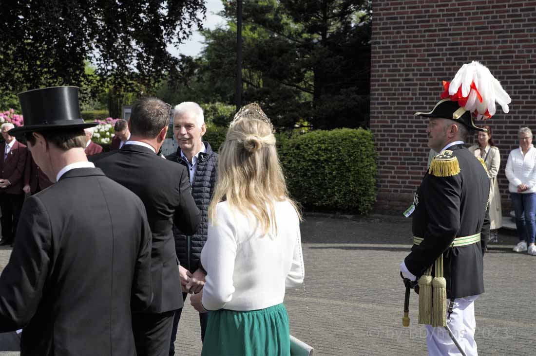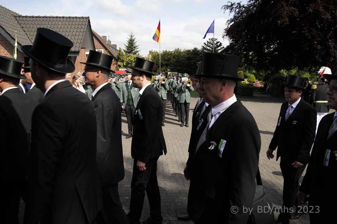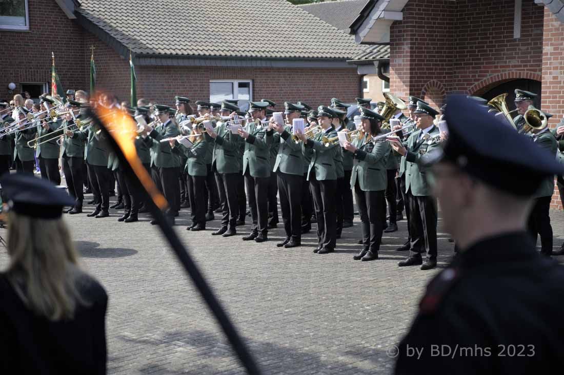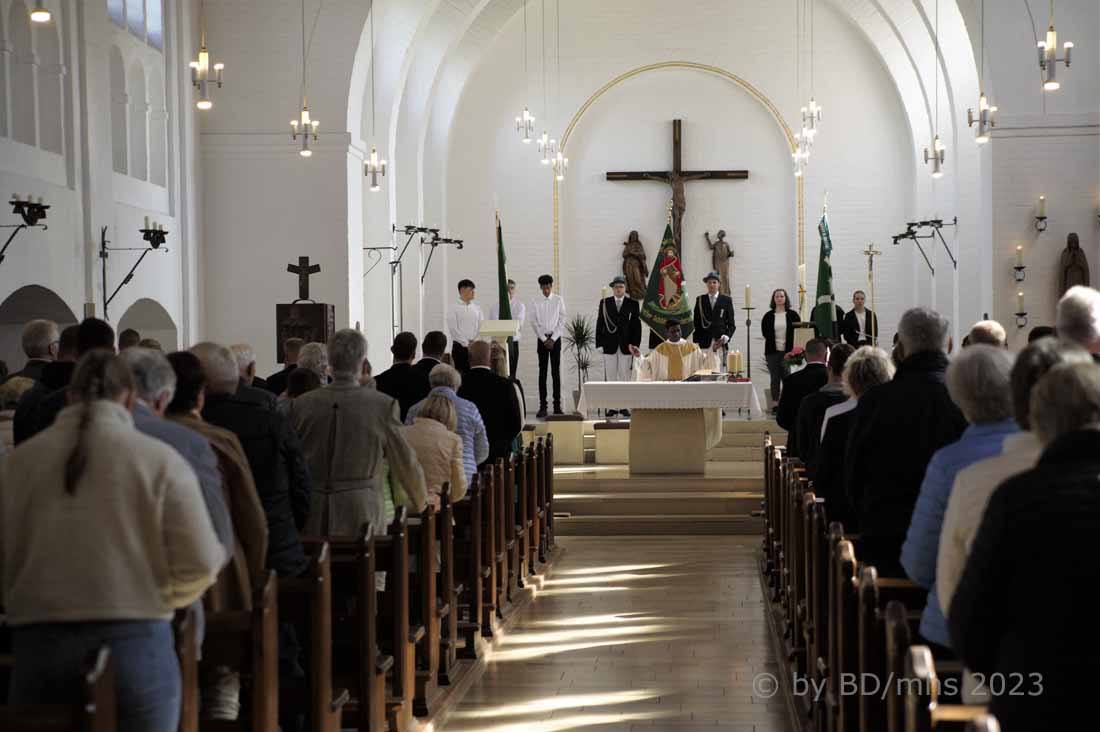 BORKENWIRTHE | bd | Der Auftakt für das Borkenwirther Schützenfest wurde am Donnerstagmorgen traditionell im Rahmen eines Gottesdienstes in der Heilig-Kreuz-Kirche am Engeland Esch gefeiert. Während die Messe, die P. John James Gnanamuthu CM zelebrierte, noch andauerte, hatten sich bei sonnigem Wetter bereits viele Gäste auf dem Kirchengelände vor dem „Büdeken“ eingefunden, um die Kranzniederlegung am Ehrenmal zu verfolgen. Wie auch in den Vorjahren wurden die Fackelträger*innen von den Wehrleuten des Löschzugs Burlo-Borkenwirthe gestellt.