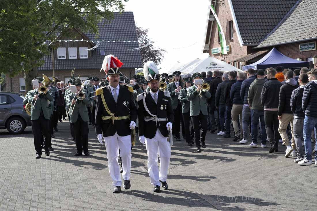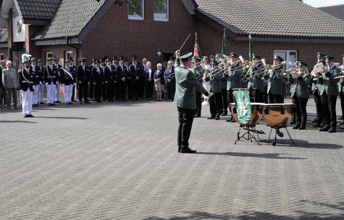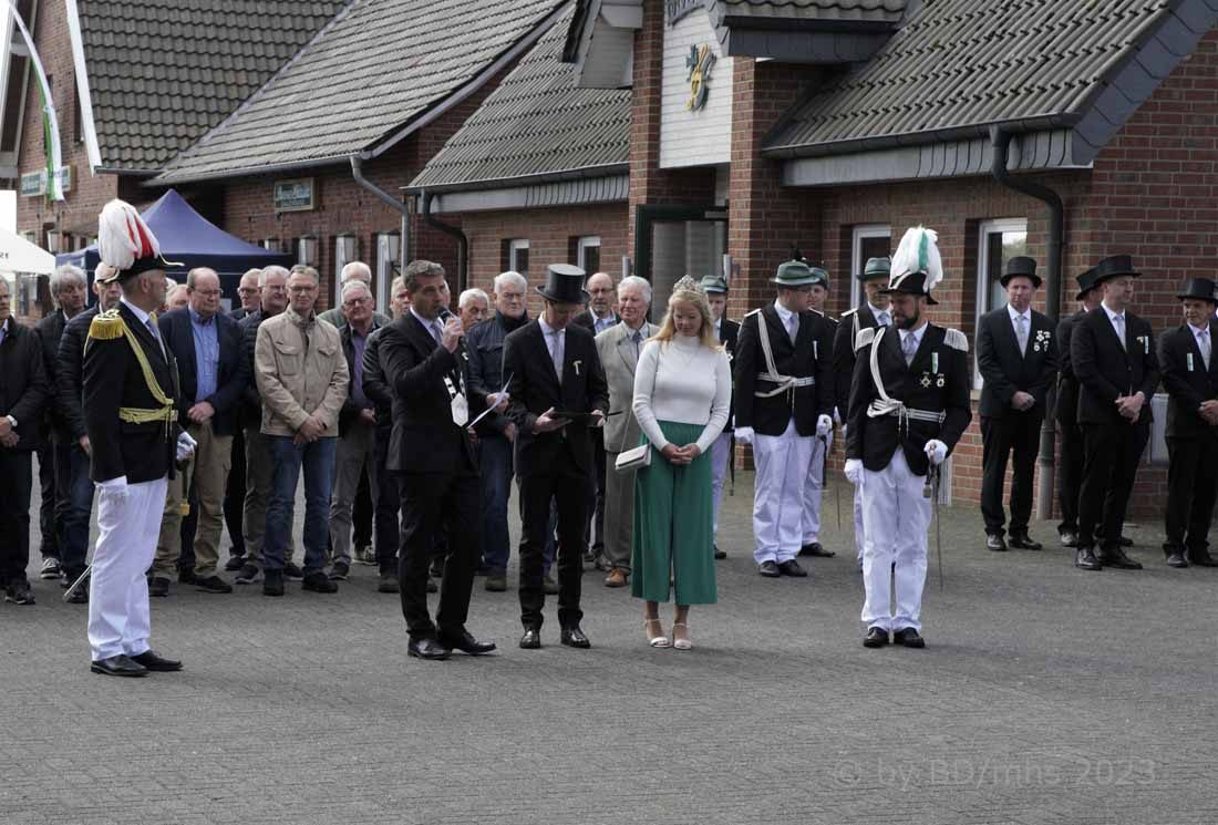 Nach einem kurzen Aufzug der Schützen unter musikalischer Begleitung der Instrumentalgruppe der KLJB Borkenwirthe sowie dem Männergesangverein Cäcilia begrüßte Vereinspräsident Heiner Albers die Gäste und erinnerte im Anschluss daran an die Gefallenen der beiden Weltkriege. „Angesichts des Leids, das durch den Krieg über unzählige Menschen in Europa hereingebrochen ist, ist es kaum nachvollziehbar, dass auch heute noch versucht wird, Konflikte gewaltsam zu lösen“, brachte er sein Unverständnis zum Ausdruck und schlug damit gleich einen Bogen zu den aktuellen Geschehnissen in der Ukraine.