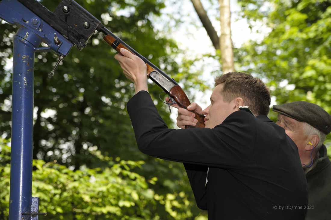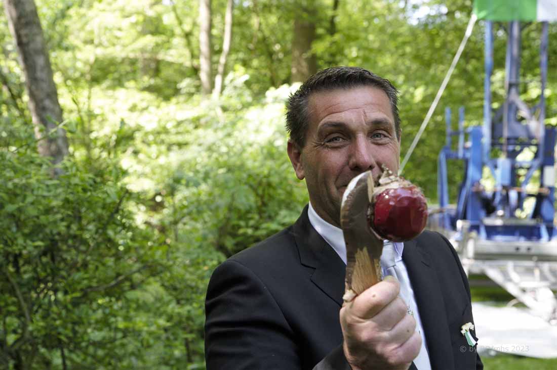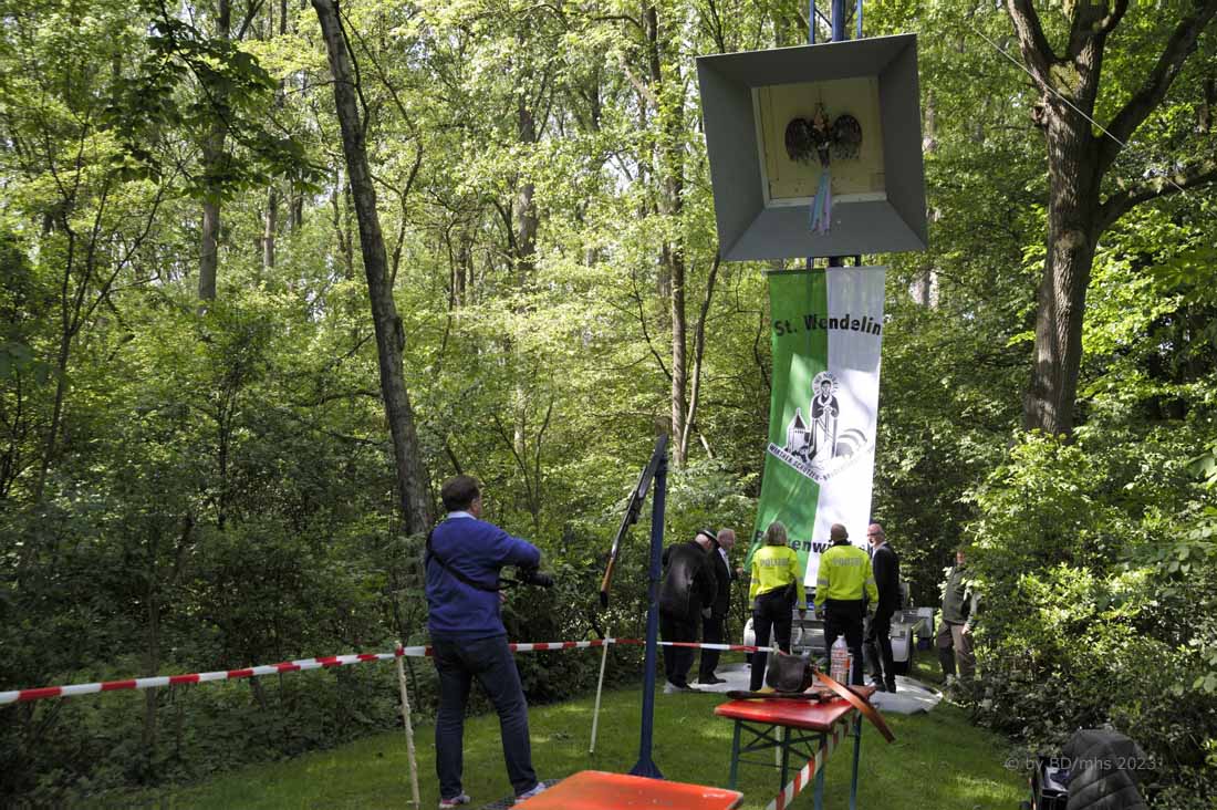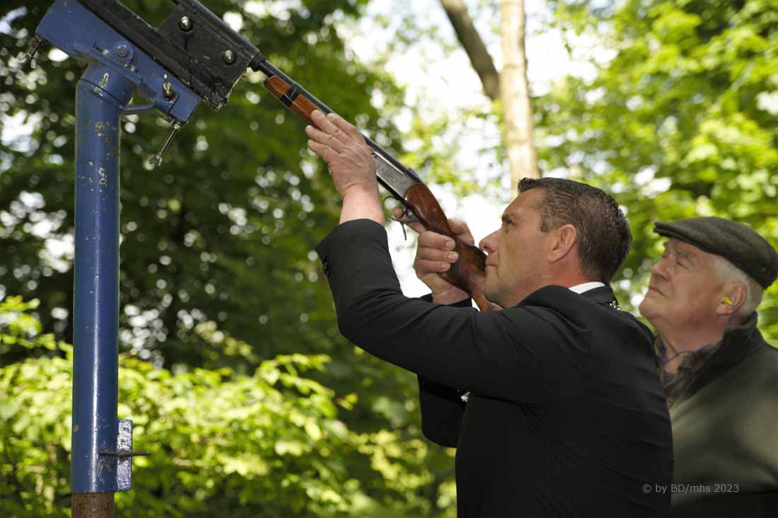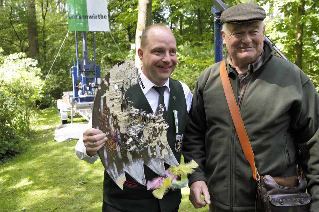 Bedrohlich wackelte der Vogel bereits gut 20 Minuten vor dem finalen Schuss. In zügigem Wechsel zielten dann die Anwärter auf die zerrupften, hölzernen Überreste im stählernen Schussfang. Präsident Heiner Albers, der genau wie die anderen Mitbewerber von den Gästen kräftig angefeuert wurde, war kurz vor dem Finalschuss gar augenzwinkernd der Meinung, dass man für die gelaufene Strecke zwischen Wartezone und Schießstand „Wegegeld“ bekommen müsse. Insgesamt freuten sich am Ende alle gemeinsam mit dem neuen Schützenkönig Jürgen Kruse, der bis ins Jahr 2024 gemeinsam mit Königin Petra Albers die Wirther St. Wendelin-Schützen anführen wird.