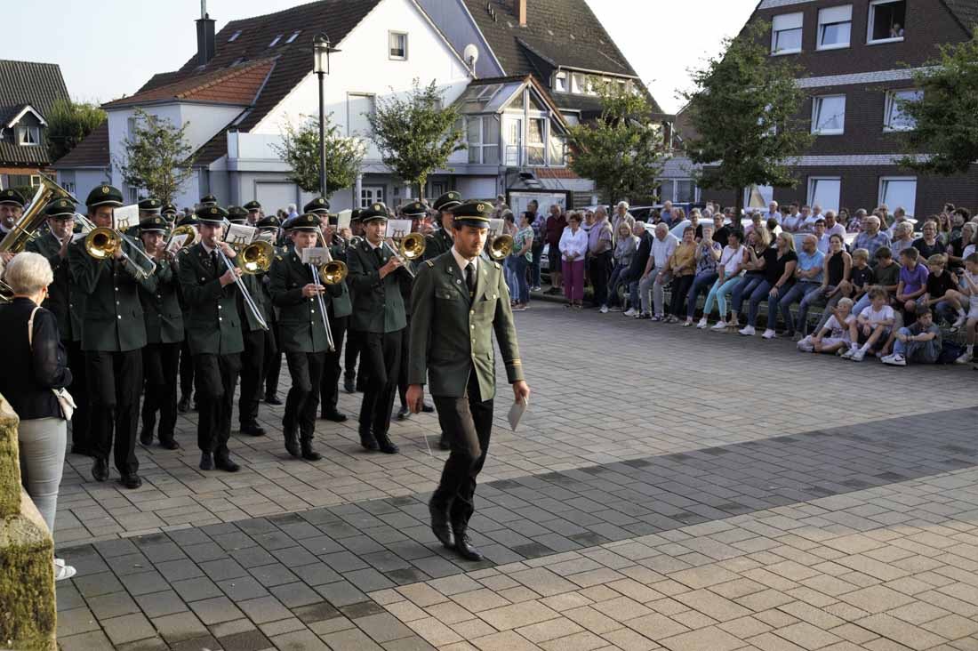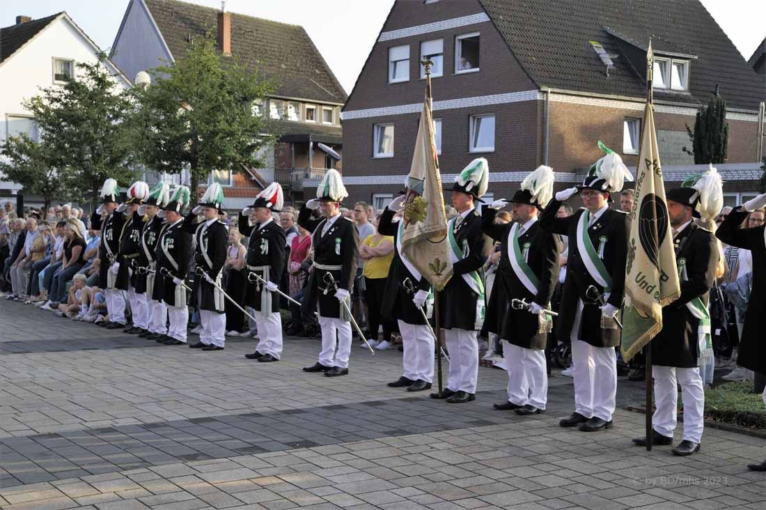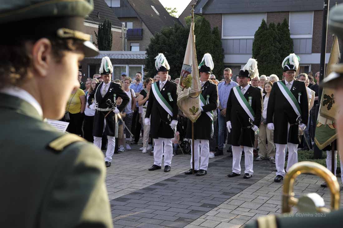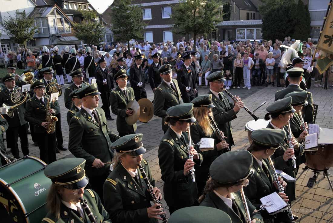 WESEKE | bd | Angesagter Treffpunkt am frühen Samstagabend war für viele Weseker:innen der Kirchplatz an der St. Ludgerus-Kirche. Dort wurde nach einem Gottesdienst mit Böllerschüssen und dem Aufmarsch der St. Ludgeri-Schützen das diesjährige Schützenfest offiziell eröffnet. Musikalisch begleitet wurde der Aufmarsch mit anschließender Kranzniederlegung, Totengedenken und großem Zapfenstreich sowohl vom Musikverein Weseke als auch vom Spielmannszug aus Südlohn.