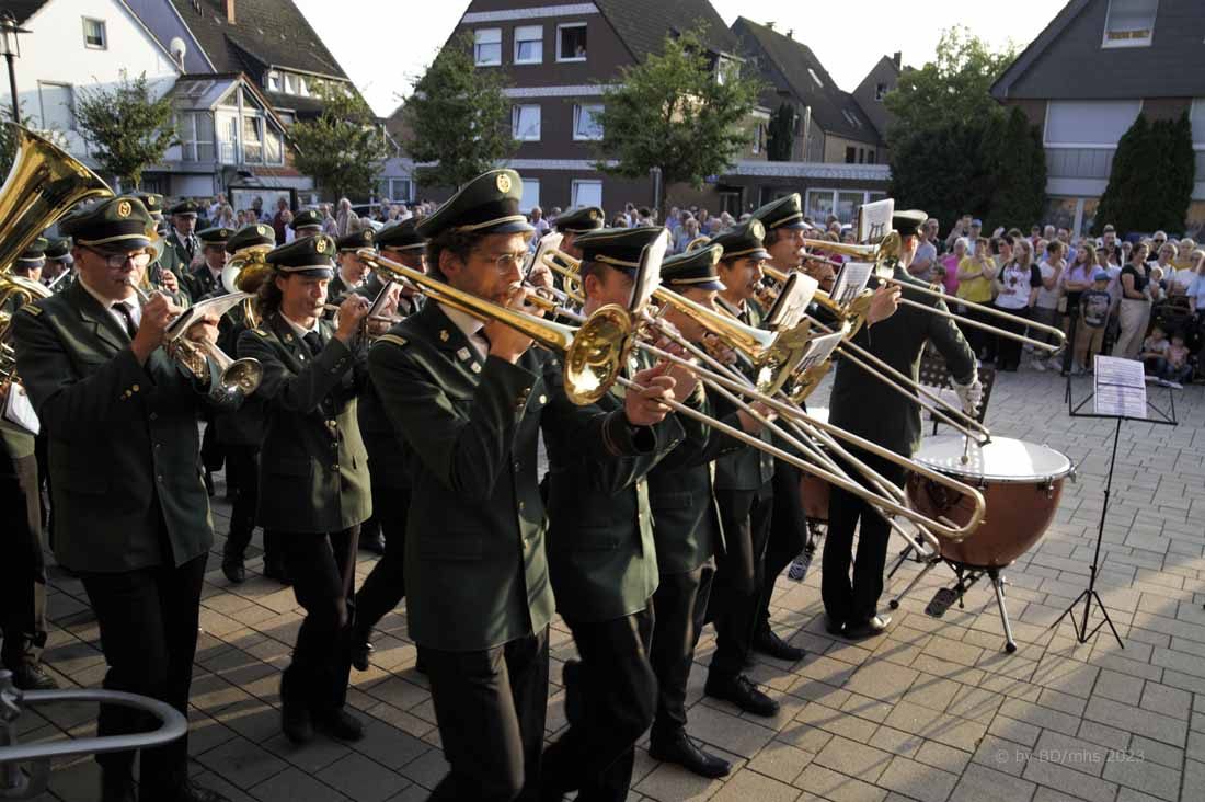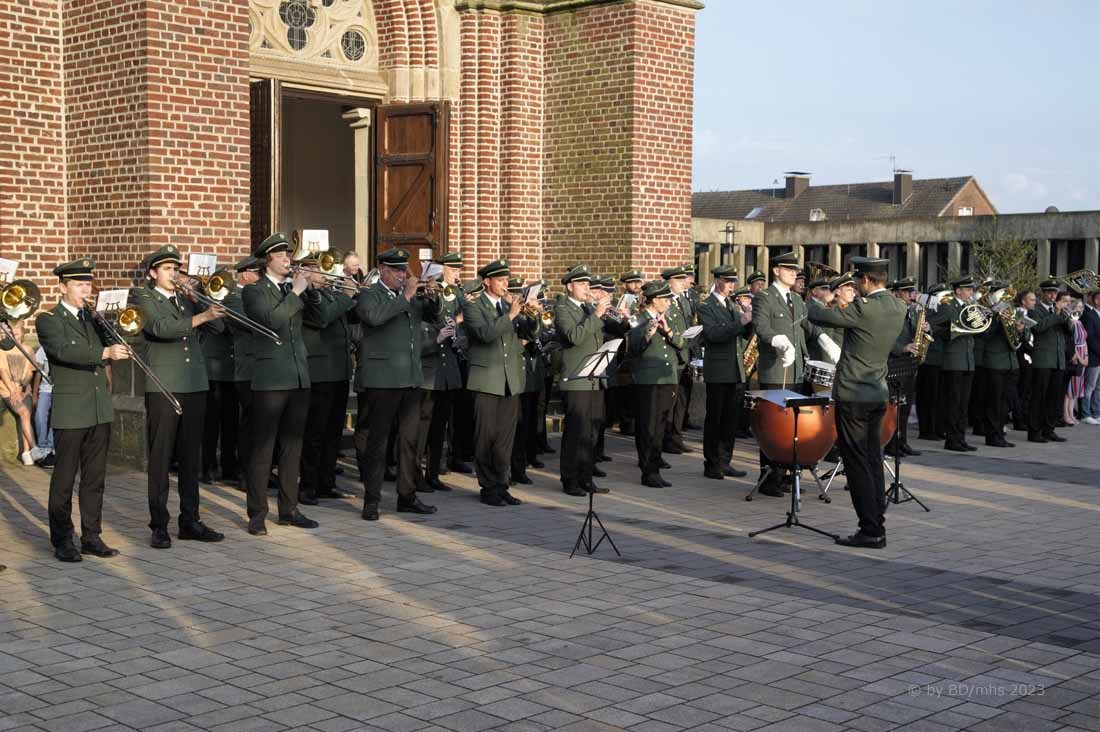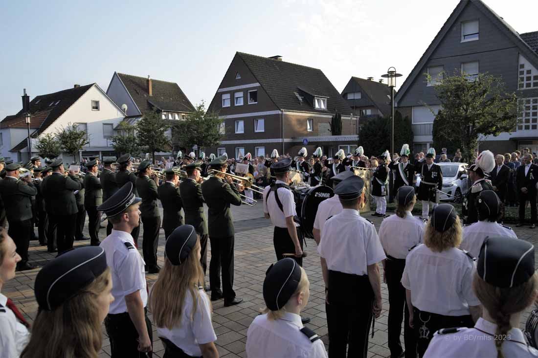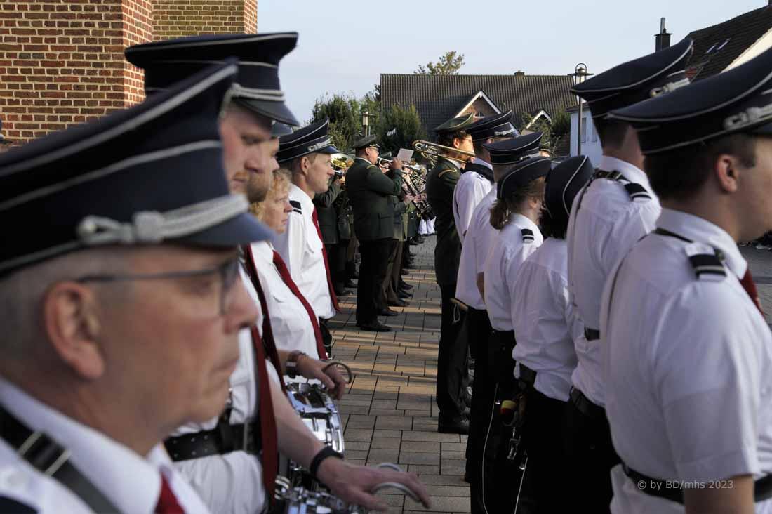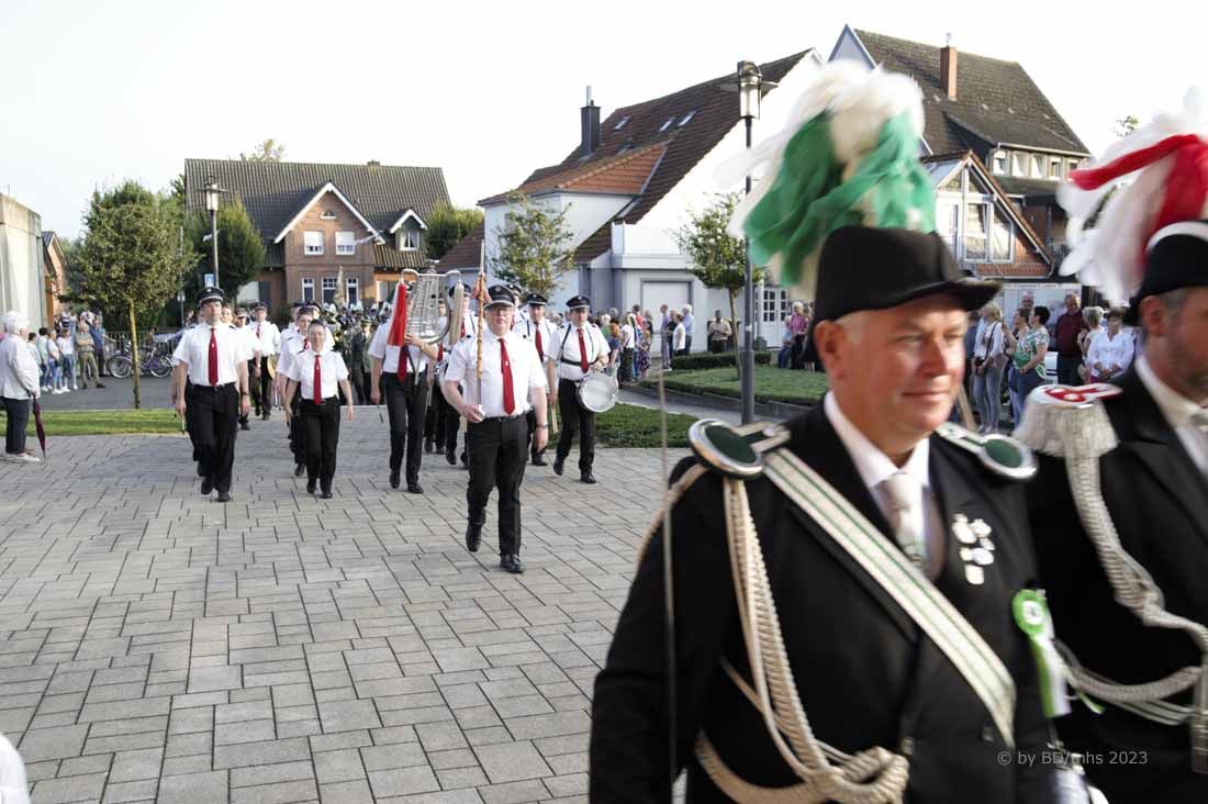 WESEKE | bd | Angesagter Treffpunkt am frühen Samstagabend war für viele Weseker:innen der Kirchplatz an der St. Ludgerus-Kirche. Dort wurde nach einem Gottesdienst mit Böllerschüssen und dem Aufmarsch der St. Ludgeri-Schützen das diesjährige Schützenfest offiziell eröffnet. Musikalisch begleitet wurde der Aufmarsch mit anschließender Kranzniederlegung, Totengedenken und großem Zapfenstreich sowohl vom Musikverein Weseke als auch vom Spielmannszug aus Südlohn.