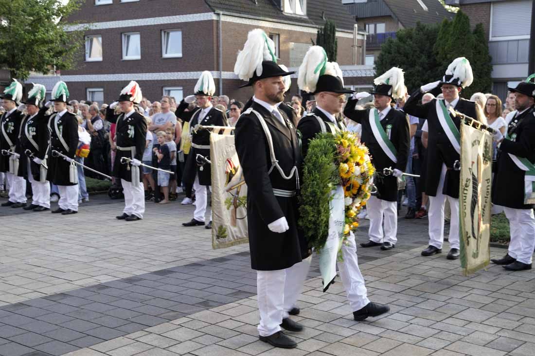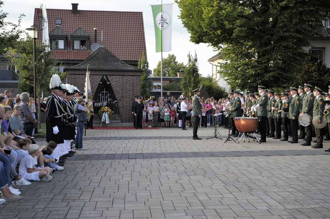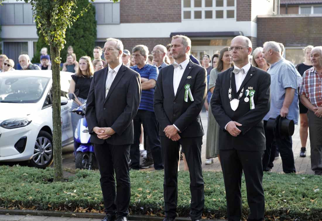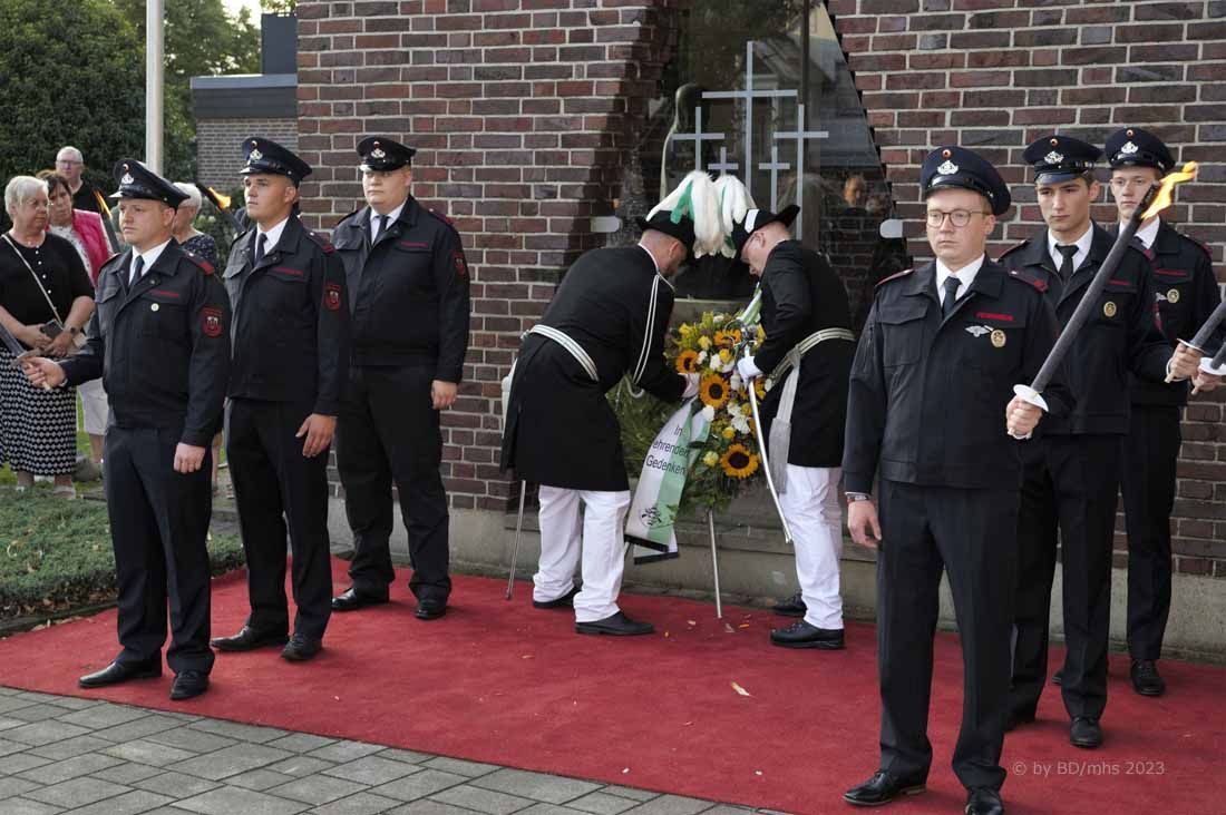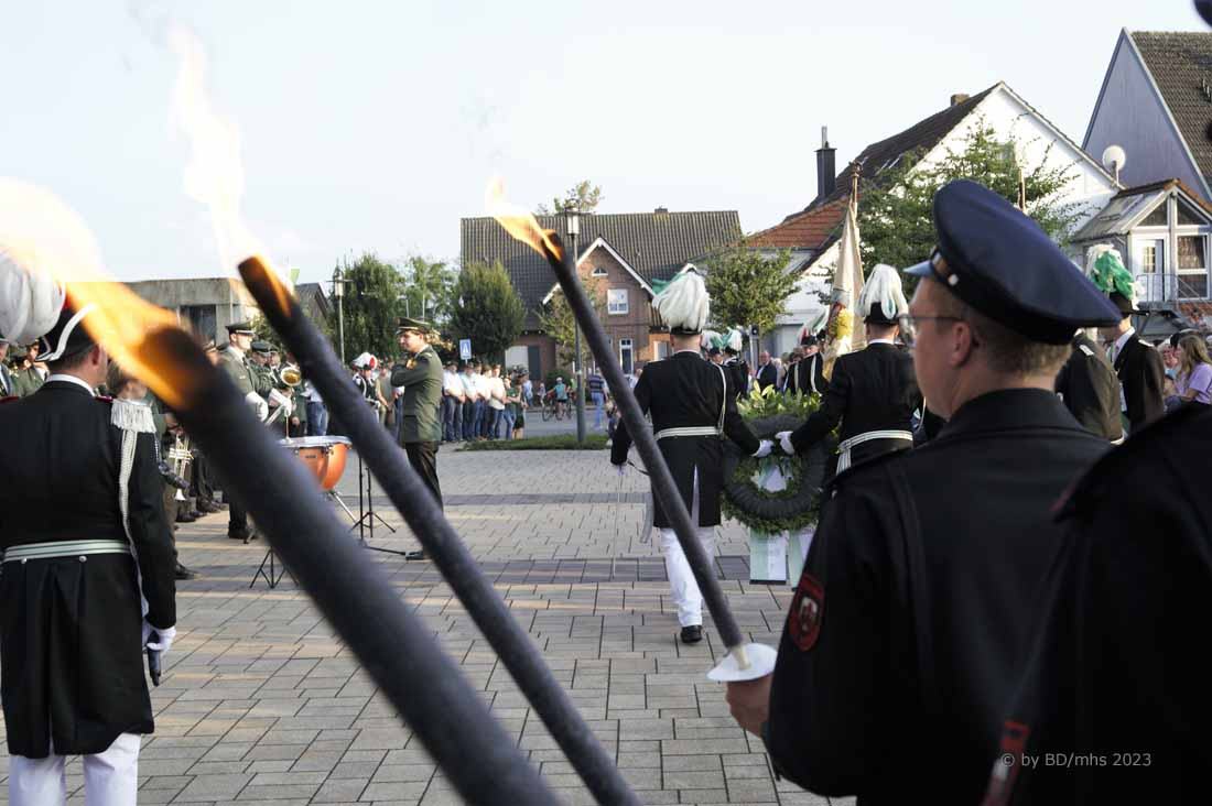 Die Zuschauer und Zuschauerinnen erlebten eine stimmungsvolle Eröffnungszeremonie, bei der einleitend von Pater Andreas Hohn OMI neben der Erwähnung der weltweit zunehmenden Anzahl kriegerischer Auseinandersetzungen zunächst mahnende Worte zu hören waren. „Es gibt nicht nur Werte, für die wir gemeinsam einstehen sollten. Es gibt vor allem auch Dinge, gegen die wir uns stellen müssen. Die in der Gesellschaft wachsende Akzeptanz rechter Gesinnung ist längst kein Warnzeichen mehr, sondern eine drohende Gefahr“, betonte er, bevor die Feierlichkeiten mit der traditionellen Kranzniederlegung und dem Totengedenken fortgesetzt wurde. Mitglieder der Freiwilligen Feuerwehr sorgten als Fackelträger traditionell für den passenden Rahmen am Ehrenmal.