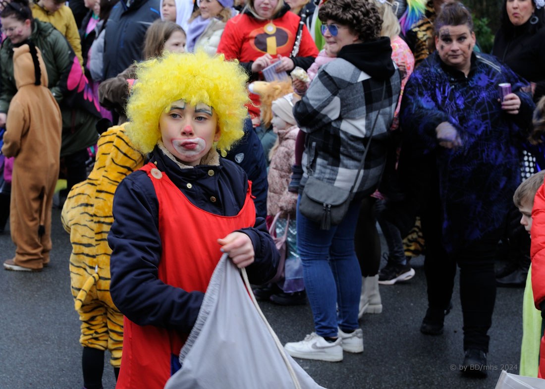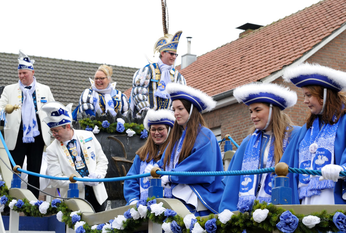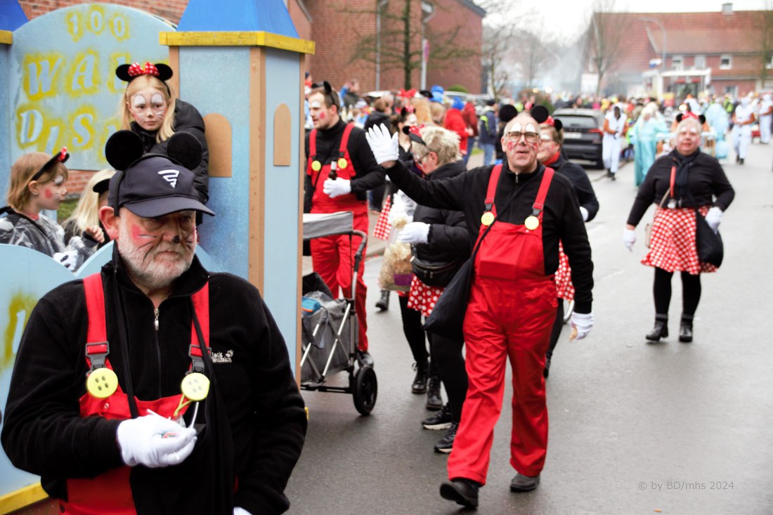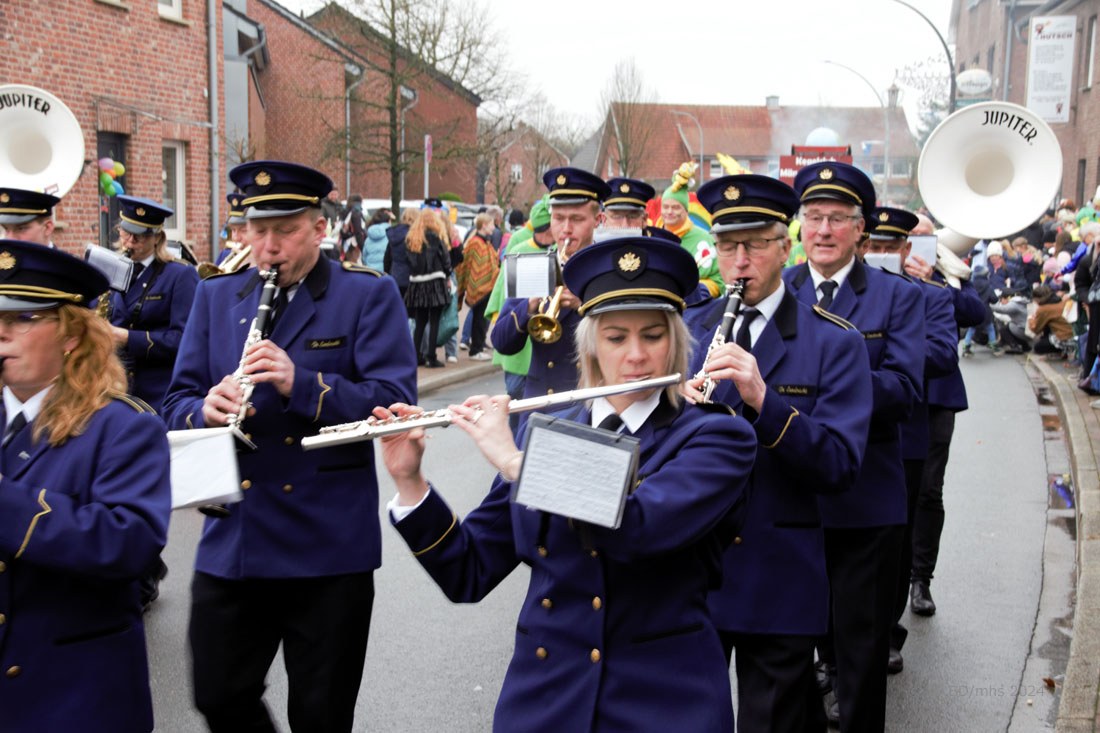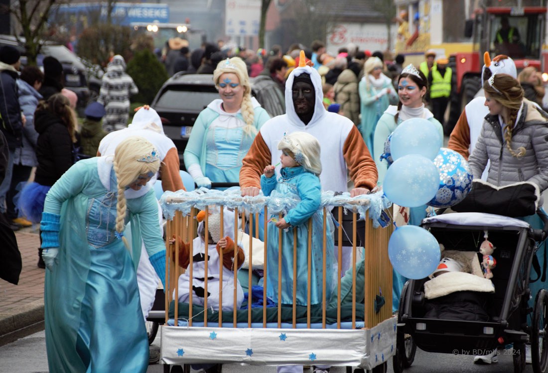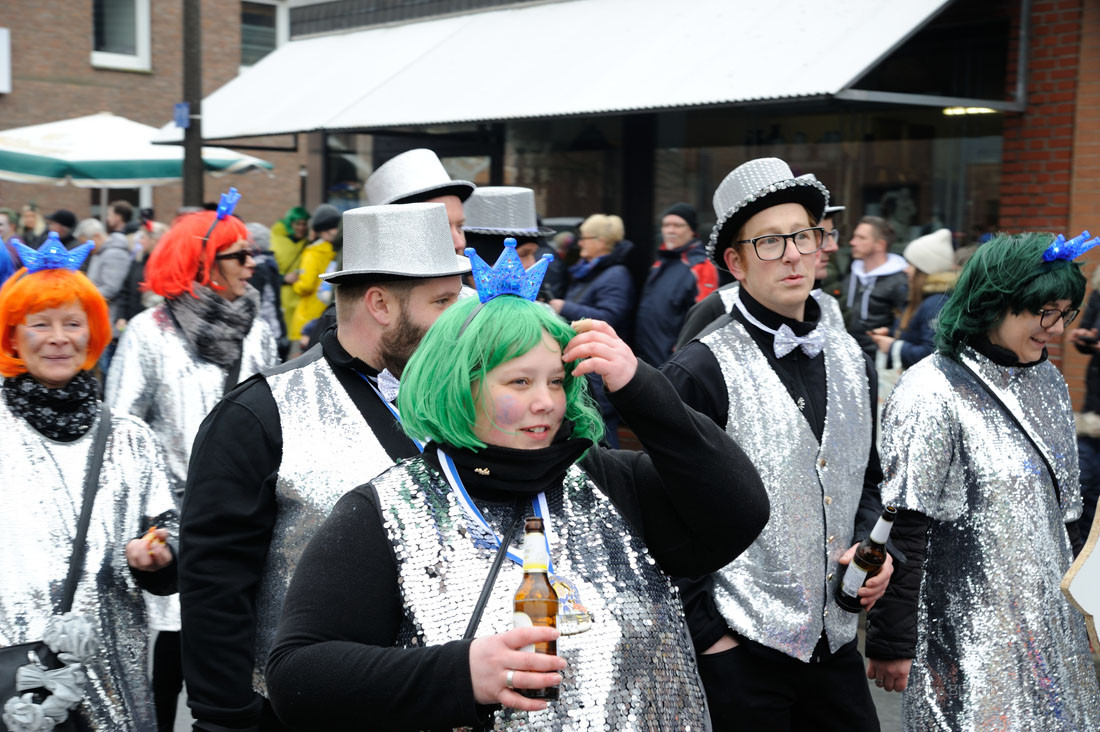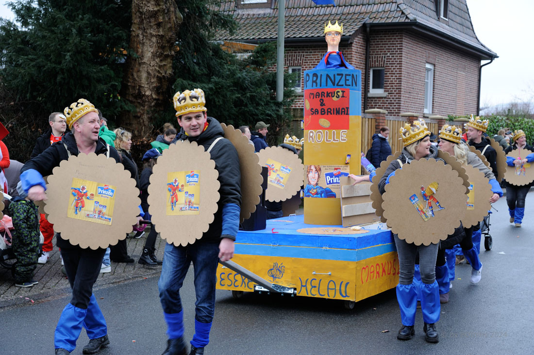 Nach Ende des Feuerwehr-Einsatzes konnte sich dann auch der Umzug des „Weseker Rosenmontagszuges“ (WRZ) in Bewegung setzen. Alle Umzugs-TeilnehmerInnen (Motivwagen, Blaskapellen, Tanz- und Fußgruppen) wurden von den feiernden Jecken in bester, karnevalistischer Manier mit lautstarken „Wäske Helau“-Rufen bejubelt. Vor allem die teilnehmenden Kinder hatten es, wie in jedem Jahr, auf die „Kamelle“ abgesehen und hatten alle Hände voll zu tun, die Vielzahl der Süßigkeiten aufzusammeln.