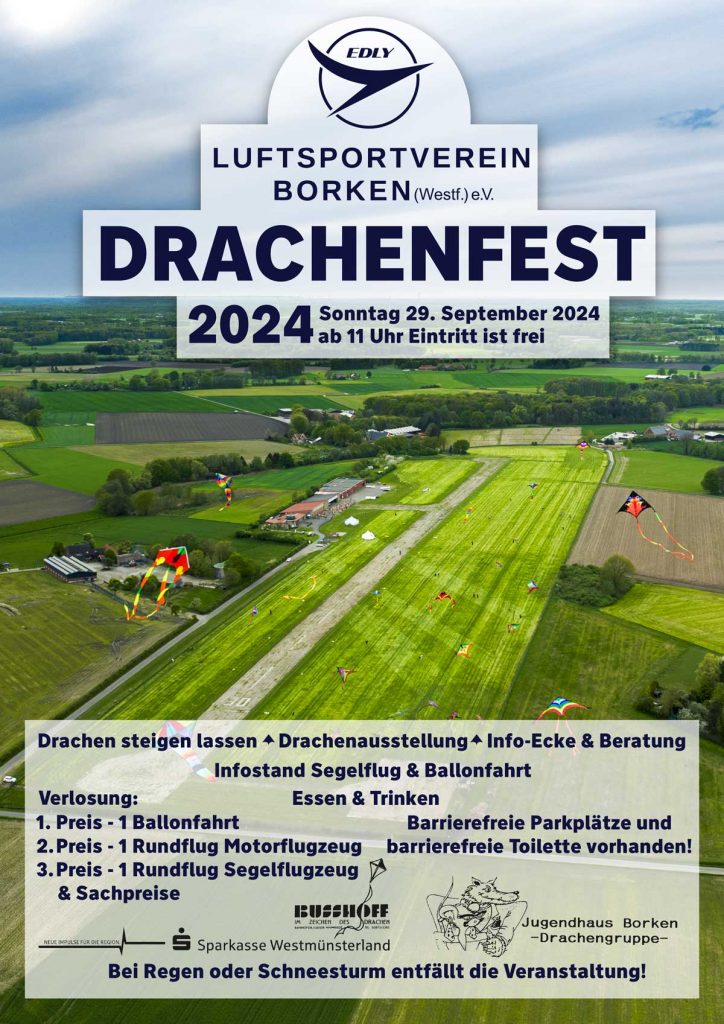 BORKEN | pd/bd | Auch in diesem Jahr bietet der Luftsportverein Borken e.V. wieder einen Sonntag für alle Drachenfreunde. Wie Harald Schmitt, langjähriges Mitglied und einer der Organisatoren des beliebten Events mitteilt, sollen die Drachen in diesem Jahr am Sonntag, den 29. September, vom Boden abheben. Sofern auch in diesem Jahr vor allem die meteorologischen Rahmenbedingungen stimmen, wird sich der Luftsportverein erneut über großen Besucherandrang freuen dürfen.