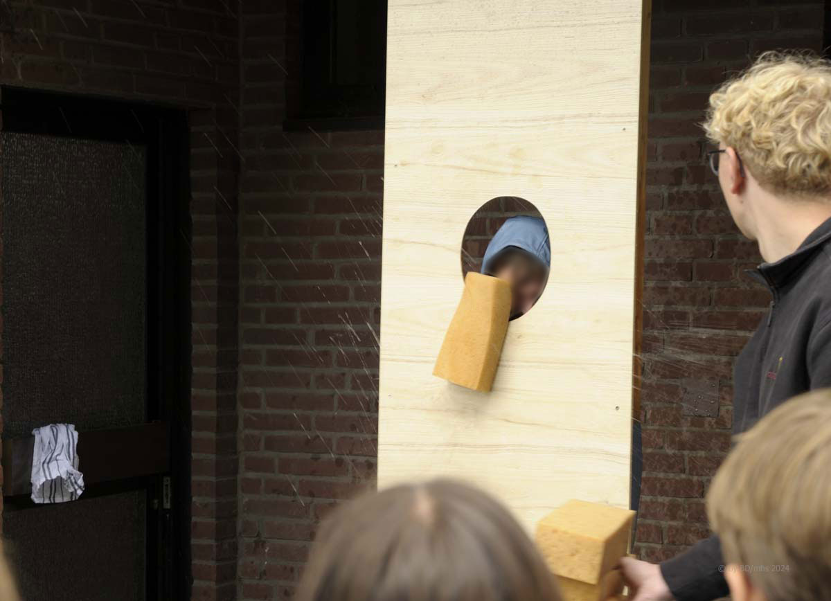 Etwas abseits des großen Trubels vergnügten sich Schüler und Schülerinnen beim Spiel „Lehrer abwerfen“, wobei es darum ging, das Gesicht eines Lehrers mit einem nassen Schwamm zu treffen. Entsprechend feucht, aber auch sehr fröhlich und mit dem größten Vergnügen gingen alle Beteiligten zu Werke.