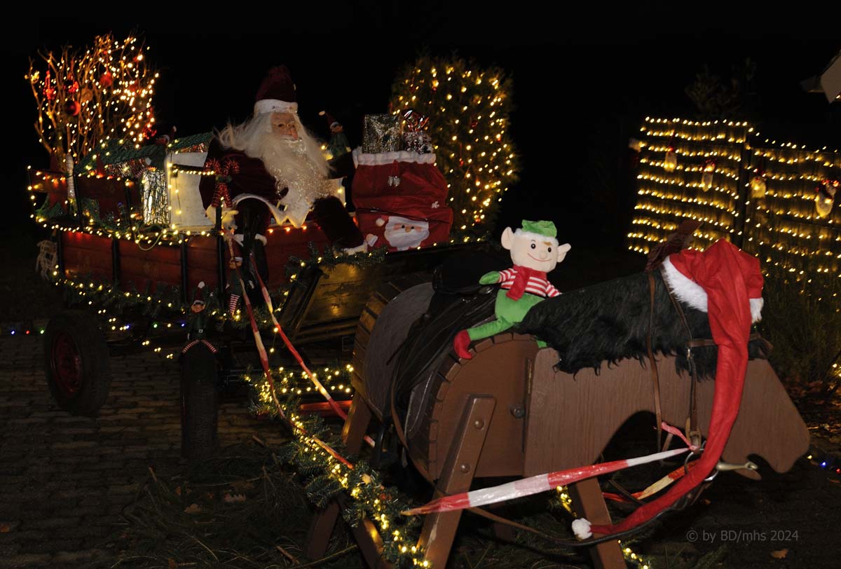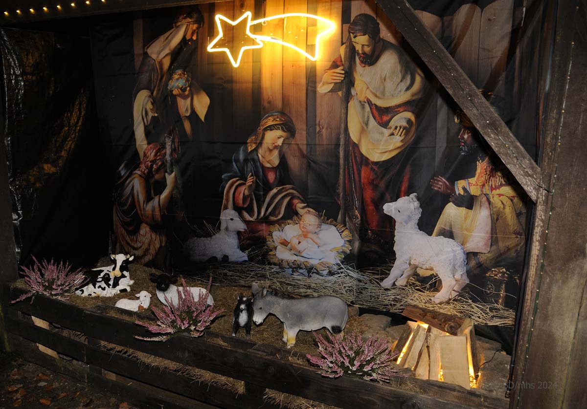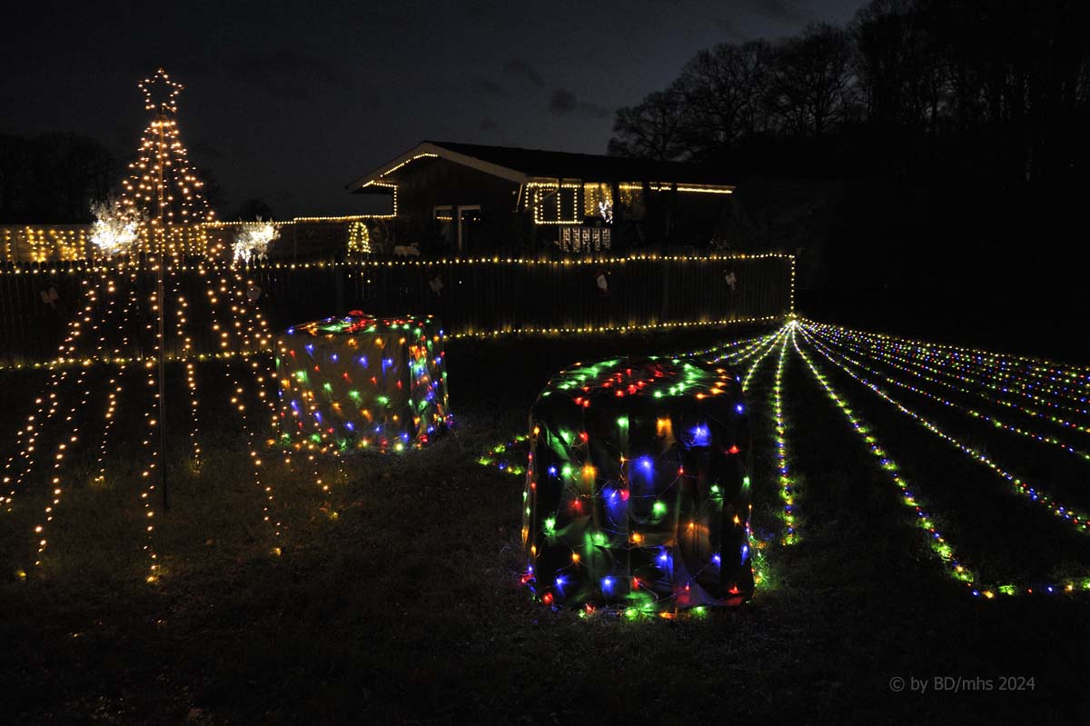 Von illuminierten Weihnachtsmann-Figuren über Kutsche und Rentier bis hin zu phantasievoll und liebevoll gestalteten und beleuchteten, geometrischen Formen bleiben für Liebhaber weihnachtlicher Beleuchtung kaum Wünsche offen. Und natürlich fehlt auch eine große Krippe nicht, deren Figuren von einem hell strahlenden „Stern von Bethlehem“ in Szene gesetzt werden.