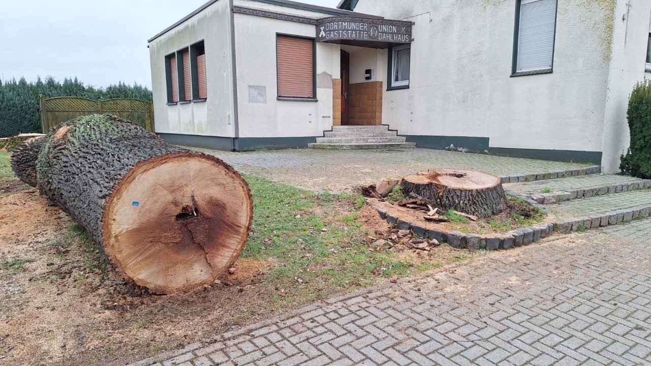 BURLO | bd | In den vergangenen Tagen wurden vom Ordnungsamt der Stadt Borken zwei alte und mächtige Eichen gefällt, die seit Jahrzehnten unmittelbar vor der ehemaligen Gaststätte Dahlhaus an der Pater-Arnold-Straße standen. Grund für die Fällung ist der Wurzelbefall durch einen holzzerstörenden Pilz, wie der Verlautbarung der Ordnungsbehörde zu entnehmen ist.