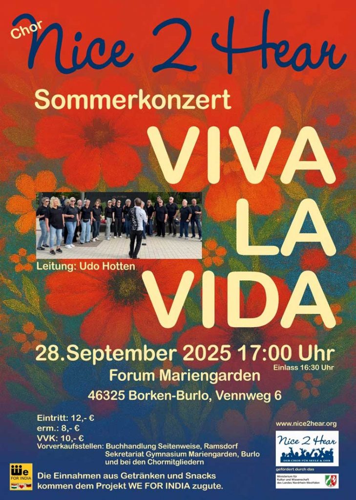 BURLO | pd | Am Sonntag, den 28.9.2025, 17 Uhr, gibt der Chor „Nice2Hear“ zum Ausklang des Sommers mit seinem Chorleiter Udo Hotten ein Konzert im Forum Mariengarden Borken-Burlo. Der Songtitel von Coldplay umschreibt den Leitfaden des Konzerts: „Es lebe das Leben.“