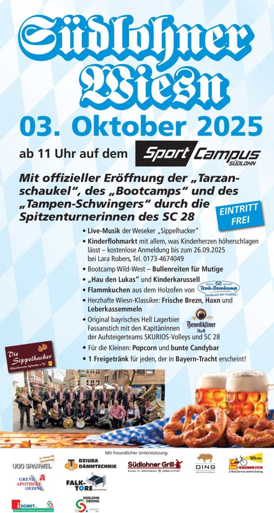 SÜDLOHN | pd | Mit Sport, Spiel, Spannung und viel Unterhaltung für die ganze Familie richtet der SC Südlohn am 3. Oktober 2025 auf dem SportCampus Südlohn sein erstes, zünftiges Oktoberfest aus. Mit frisch gebackenen Brezn, Flammkuchen, Leberkäs in der üblichen Semmel sowie leckeren Haxen werden die Gäste in der Zeit von 11 bis 18 Uhr bajuwarisch verwöhnt. Und die Gaudi in typisch bayerischer Wiesn-Manier bleibt auch nicht auf der Strecke, versprechen die Organisatoren. Wer in „Tracht“ kommt, erhält zudem noch ein Freibier „auf’s Haus“.
