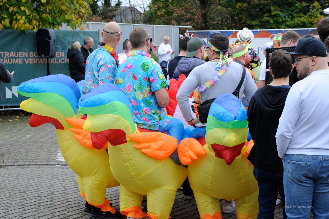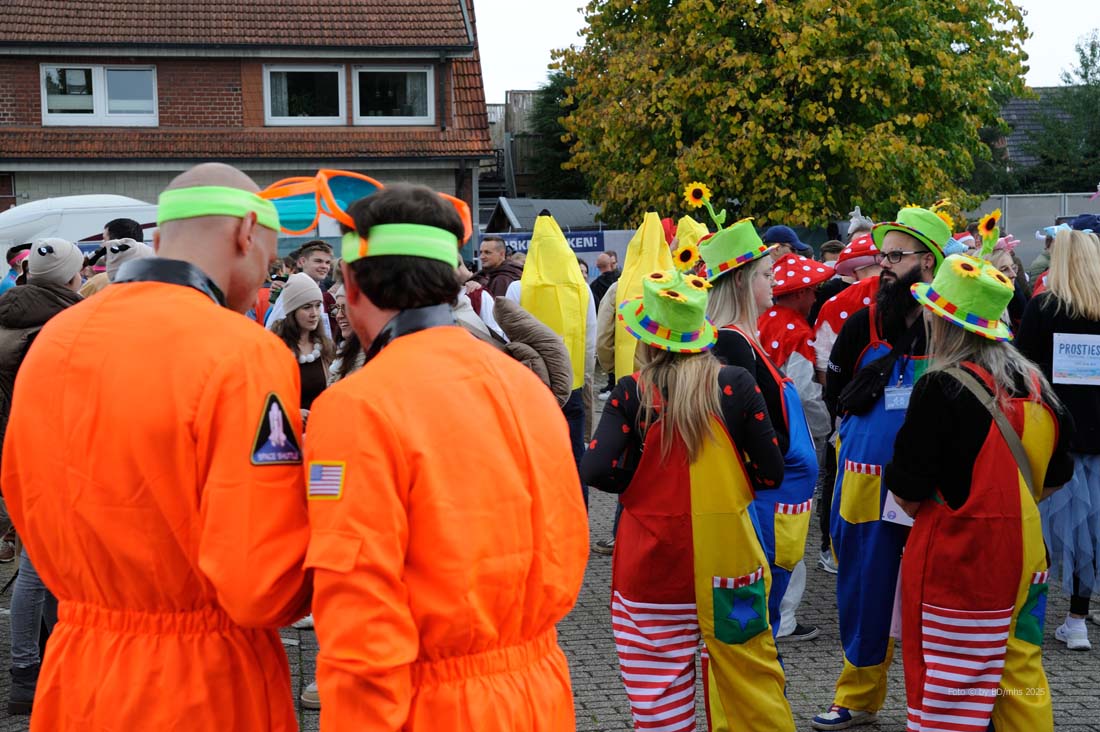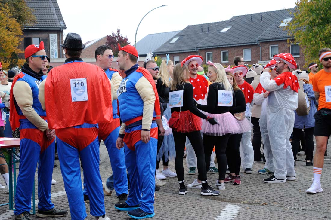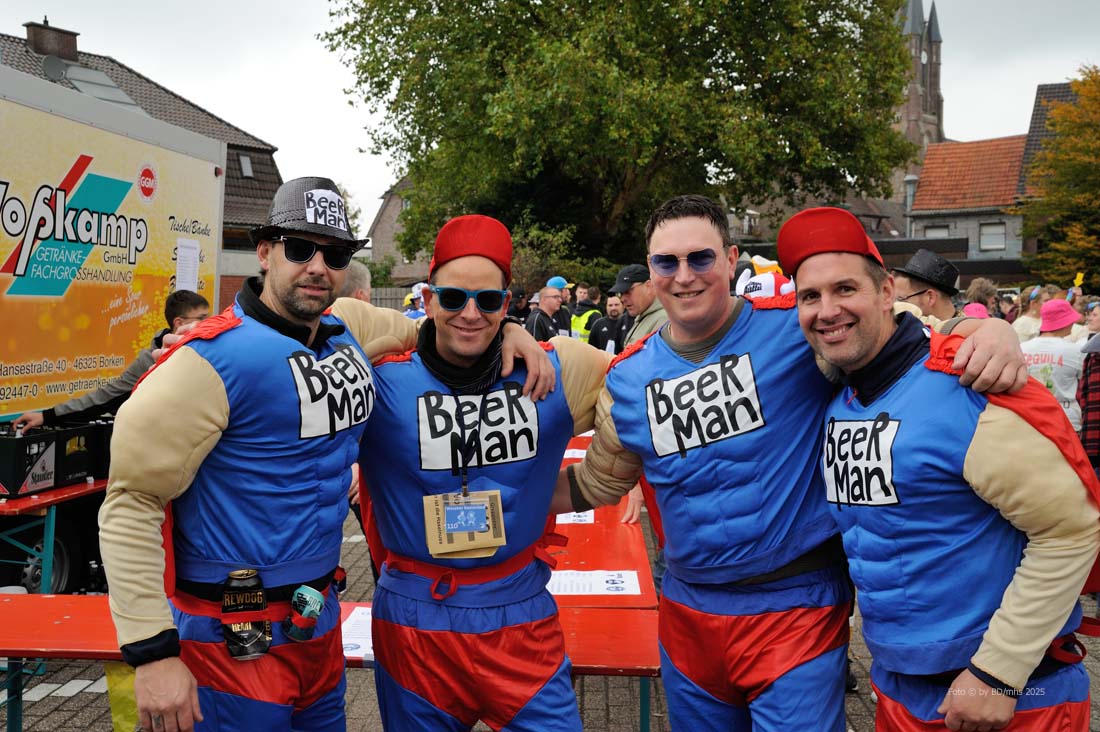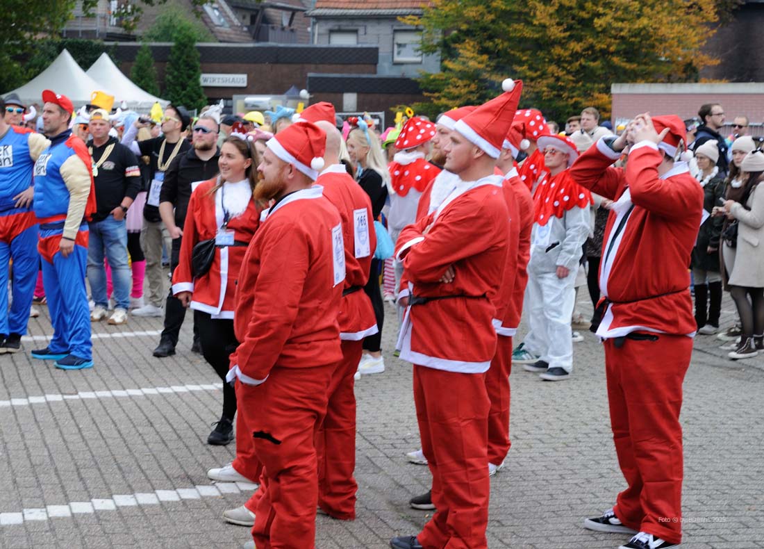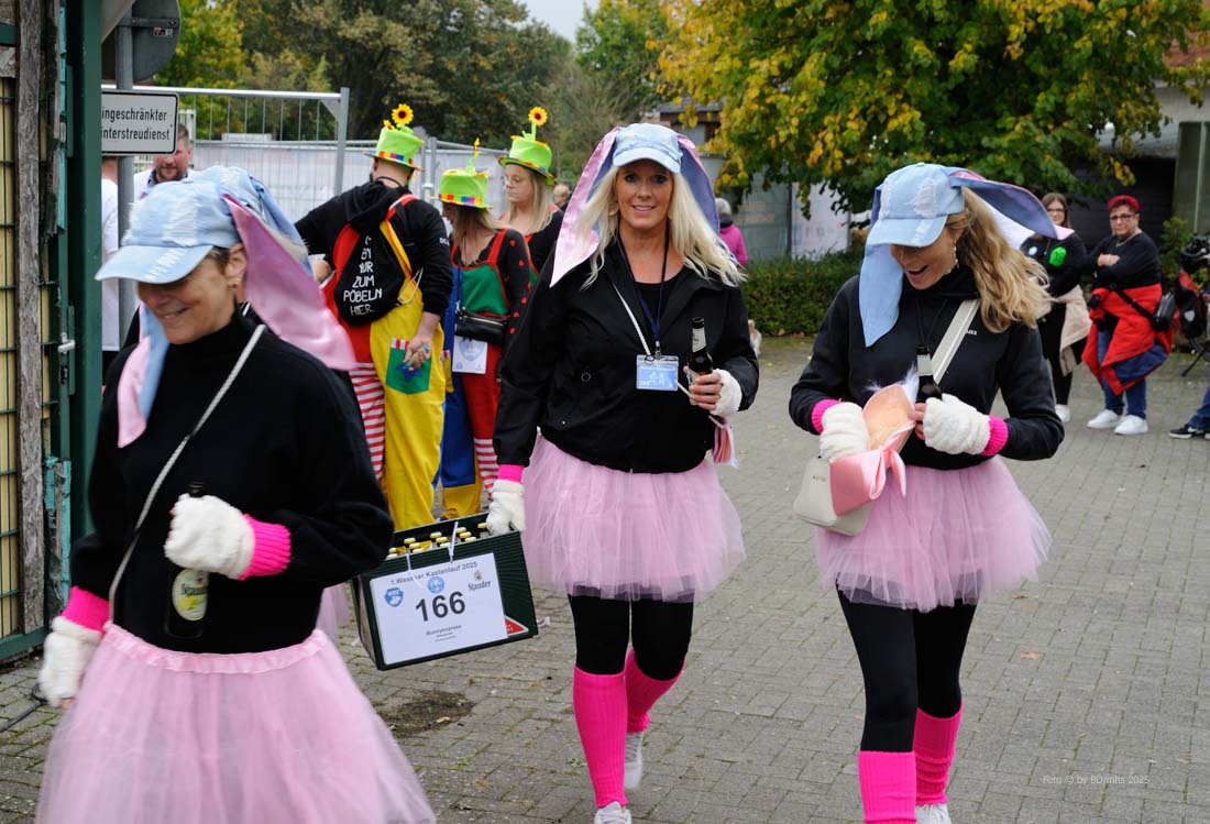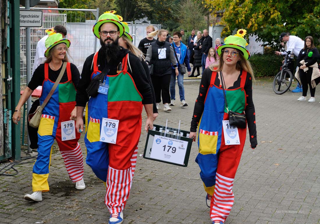 WESEKE | bd | Am Samstagnachmittag hatten sich in Weseke pünktlich um 14 Uhr rund 350 bunt kostümierte Personen auf dem Parkplatz an der Einmündung Borkenwirther Straße/Schlückersring eingefunden und waren somit der Einladung des Weseker Rosenmontagszuges (WRZ) zum 1. Weseker Kastenlauf gefolgt. Aufgabe der vierköpfigen Damen-, Herren- oder Mixed-Gruppen war es, während dieses – laut WRZ wohl sportlichsten Trink-Events der Region – einen Kasten Bier über eine Distanz von 5 Kilometern zu transportieren, diesen bis zum Erreichen der Ziellinie zu leeren und während der Strecke noch einige Geschicklichkeitsspiele zu absolvieren.