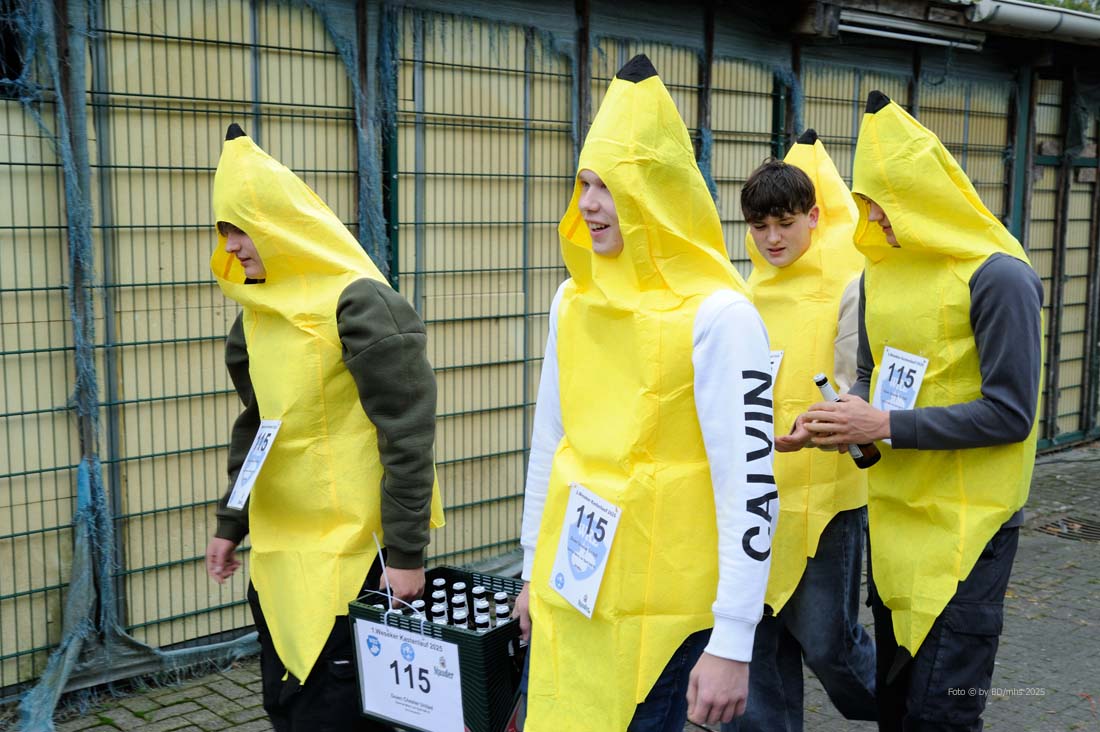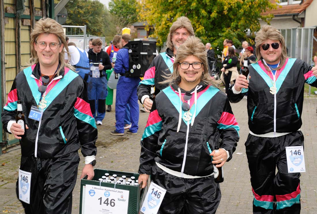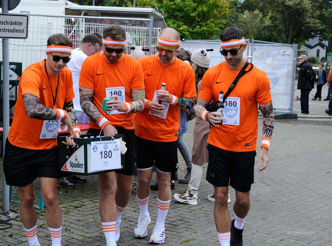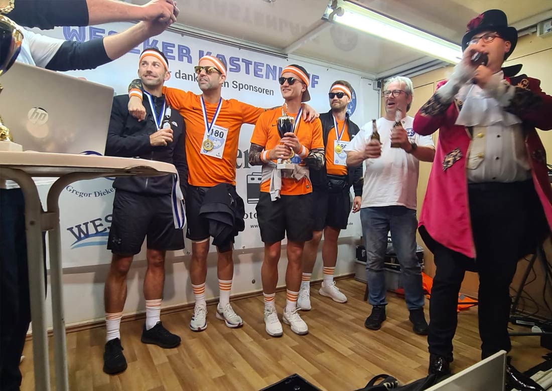 Das Startgeld von 25 Euro pro Gruppe (beinhaltete einen Kasten Bier/Radler) geht an den Weseker Rosenmontagszug, der mit dem Angebot wohl einen Volltreffer gelandet hat. Annähernd alle Beteiligten waren in bunten und einfallsreichen Kostümierungen angetreten und hatten nicht nur gute Laune im Gepäck, sondern bis in die Abendstunden auch eine Menge Spaß. Einen fröhlichen Ausklang nahm der 1. Weseker Kastenlauf, bei dem auch das noch amtierende Prinzenpaar Markus II & Andrea III nicht fehlten, bei einer „After Kastenlauf-Party“, die erst auf dem Außengelände gefeiert und im Anschluss in einer nahe gelegenen Gaststätte fortgesetzt wurde.