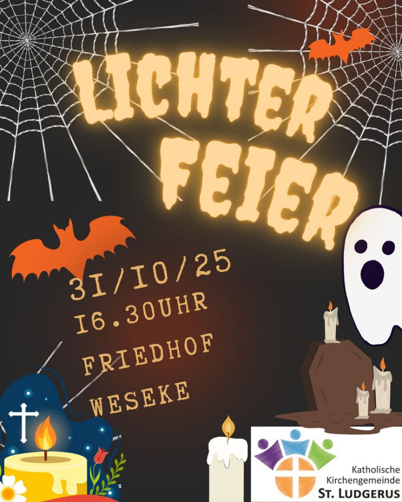 WESEKE | pd | Die Pfarrei St. Ludgerus feiert den Halloweenabend und den Vorabend von Allerheiligen gemeinsam mit allen Kindern der Gemeinde. Verkleidungen sind ausdrücklich erwünscht. Es wird gemeinsam gesungen, gebetet und alle lernen das Gespenst Ada kennen. Dazu sind alle Familien am 31.10.25, um 16.30 Uhr auf dem Friedhof Weseke eingeladen.