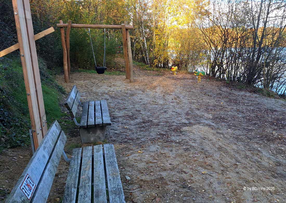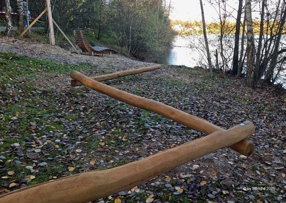 An gleicher Stelle sowie an zwei weiteren Spiel- und Informationspunkten unweit des Zugangs wurden die Ständerwerke für die angekündigten Informations-Tafeln sowie weitere Sitz- und Spielgeräte installiert und der Boden entsprechend aufbereitet und präpariert. Derzeit sind diese Bereiche noch mit rot-weißem Flatterband als Baustelle gekennzeichnet und abgesperrt.