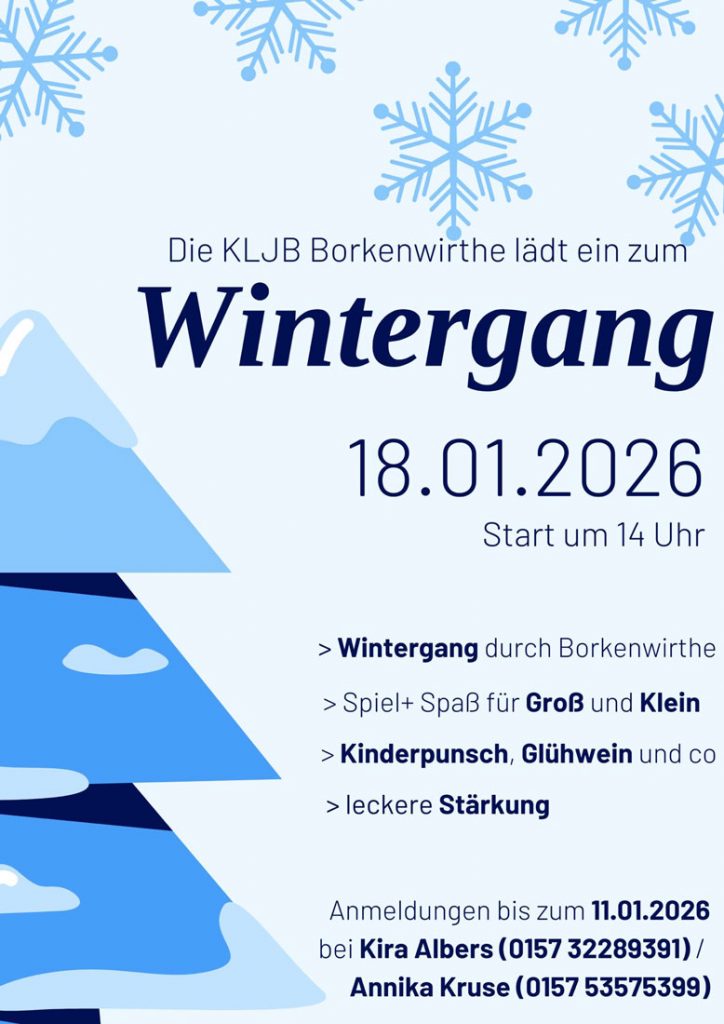 Neben der Tannenbaumaktion lädt die KLJB gleichzeitig für den 18. Januar 2026 alle Familien und Gemeindemitglieder zum Wintergang durch Borkenwirthe ein. Der Startschuss dazu fällt an diesem Tag um 14 Uhr. Alle weiteren Informationen dazu können dem Plakat entnommen werden.