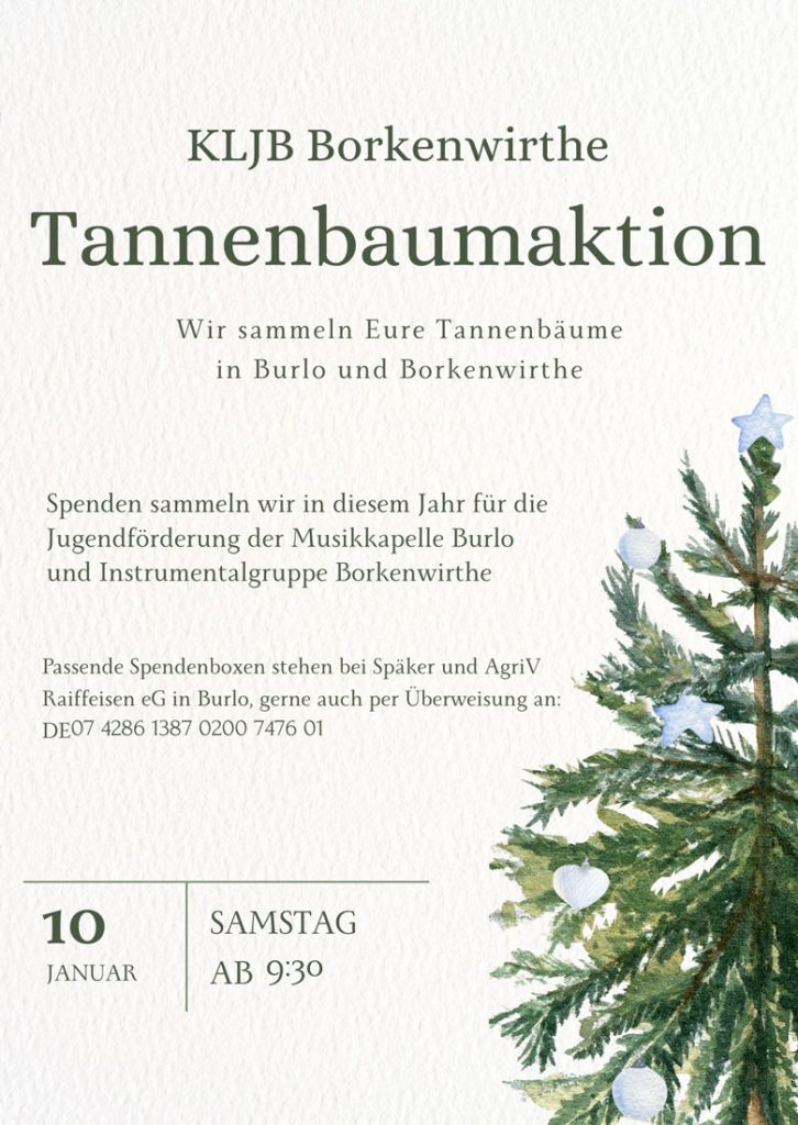 Am Samstag, den 10. Januar 2026, wird die Gruppe erneut durch die Gemeinden ziehen und die Tannenbäume einsammeln. Dazu wird um Spenden gebeten, die in diesem Jahr an die Jugendförderung der Musikkapelle Burlo und der Instrumentalgruppe Borkenwirthe gehen sollen. Wie in jedem Jahr wird darauf hingewiesen, dass dazu passende Spendenboxen im Raiffeisen-Markt in Burlo sowie in der Bäckerei Späker aufgestellt sind. Gespendet werden kann auch direkt per Banküberweisung unter dem Verwendungszweck „Spende Tannenbaumaktion“ (IBAN: DE07 4286 1387 0200 7476 01). Bitte keine Spendengelder an den zur Abholung bereitgelegten Bäumen hinterlegen.