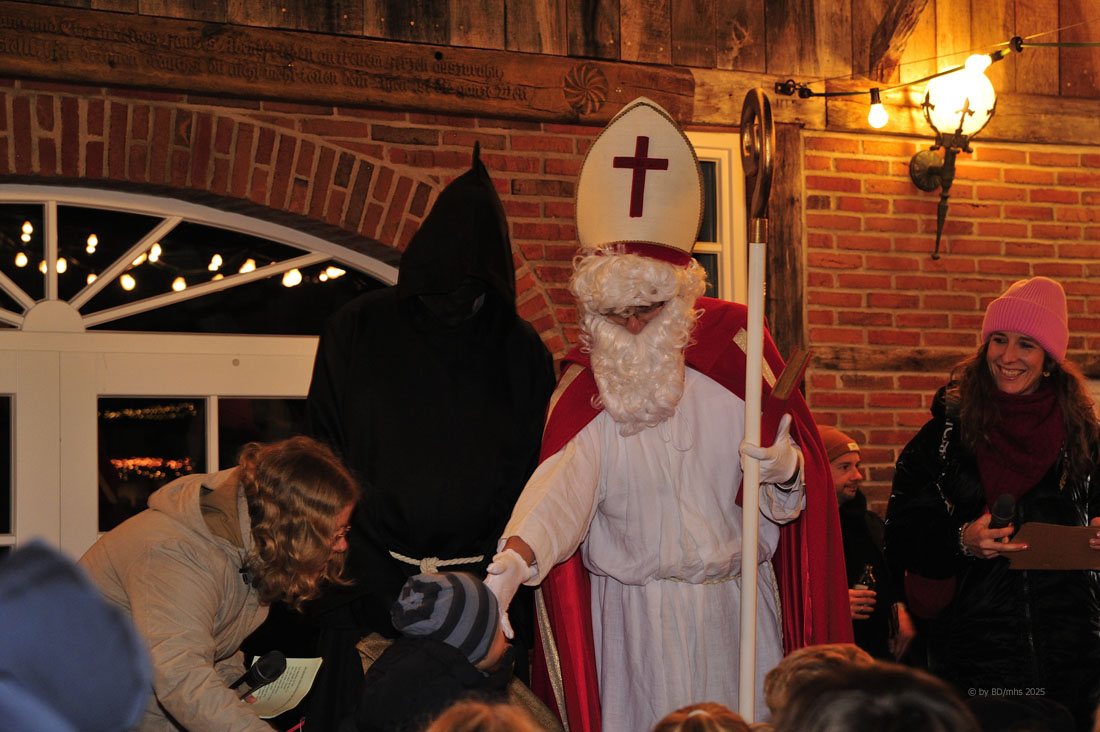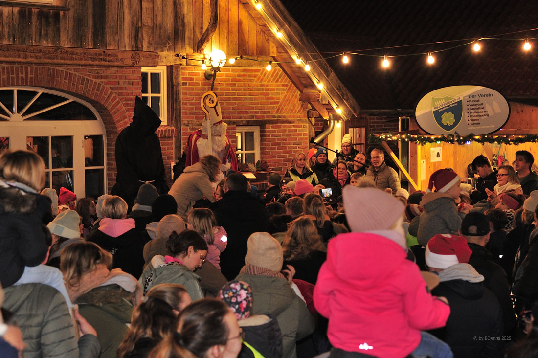 BURLO | bd | Einmal mehr erwies sich am vergangenen Wochenende der Weihnachtsmarkt in Burlo als Anziehungspunkt für Besucher und Besucherinnen aus der gesamten Region. Schon zu Beginn am frühen Samstagnachmittag, als der Nikolaus mit seinem Begleiter „Knecht Ruprecht“ nach vorangegangenem Umzug durch die Gemeinde auf das Gelände am Heimathaus zog, gab es auf dem großen Platz unmittelbar vor dem Hauptgebäude kaum ein Durchkommen. Auch in diesem Jahr war es den Organisatoren und ehrenamtlichen Helferinnen und Helfern einmal mehr gelungen, mit einer zauberhaften Stimmung zum Einstieg in die Adventszeit viele Besucher*innen anzulocken. Mit über 20 Ständen, allesamt stilvoll und dem besinnlichen Anlass entsprechend in Szene gesetzt, fiel der Markt in diesem Jahr noch etwas größer aus als in den Vorjahren.