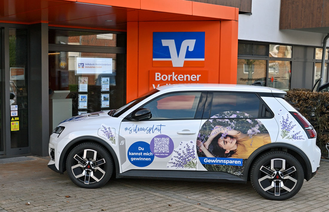 BURLO | bd | Wer in den vergangenen Tagen die Volksbank-Filiale in Burlo an der Borkener Straße aufgesucht hat, dem ist vermutlich der mit bunten Aufklebern versehene und vor dem Zugang geparkte Kleinwagen nicht verborgen geblieben. Was es mit dem Fahrzeug auf sich hat, darüber klärte heute Filialleiter Ömer Seyrek auf: „Das Fahrzeug gehört vielleicht schon bald einem unserer Gewinnsparenden – und das völlig ohne zusätzlichen Einsatz. Der Gewinner bzw. die Gewinnerin wird aus allen Sparern ermittelt, die ein gültiges Gewinnspar-Los besitzen und mindestens 18 Jahre alt sind“, erläutert Seyrek im Gespräch mit Burlo-Direkt. Doch nicht nur der kleine Flitzer wird bei der Ziehung, die am 13. Januar 2026 erfolgt, in die Hände eines neuen Besitzers/einer neuen Besitzerin übergeben, sondern auch über 222 Reisen nach Paris mit einem Gutschein von je 2.000 Euro können sich die Gewinner*innen freuen.