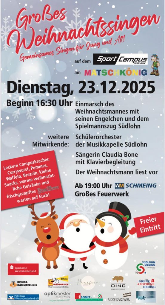 SÜDLOHN | pd | Am 23.12.2025 gibt es erneut auf deem Sportcampus in Südlohn ein Weihnachtssingen für jung und Alt. Der Einmarsch des Weihnachtsmannes wird vom Spielmannszug Südlohn sowie einigen „Engelchen“ begleitet, versprechen die Organisatoren des Events, das im vergangenen Jahr über 800 Gäste auf den Campus lockte.