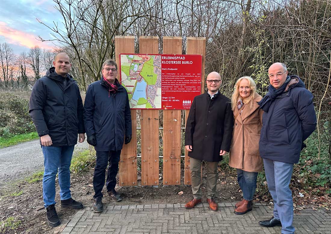 BURLO | pd/bd | Wie zuletzt Mitte November angekündigt, wurde der lang avisierte „Erlebnispfad Klostersee“ in Burlo nun von Vertretern der Stadt Borken der Öffentlichkeit übergeben. An der Übergabe hatten am Donnerstag Bürgermeisterin Mechtild Schulze Hessing, die Beigeordneten Norbert Nießing und Jürgen Kuhlmann, der Leiter des Bauordnungsamtes Thorben Schulze Dinkelborg sowie Holger Wüstnienhaus als stellvertretender Sprecher der Dorfvertreterversammlung teilgenommen.