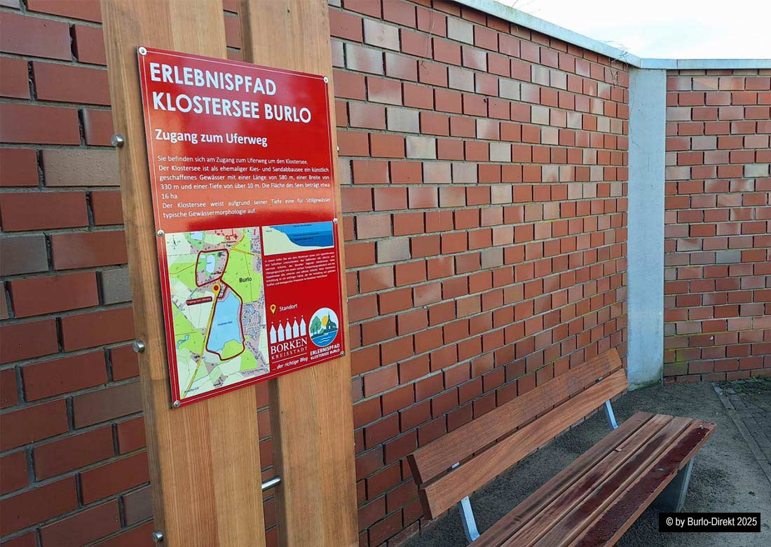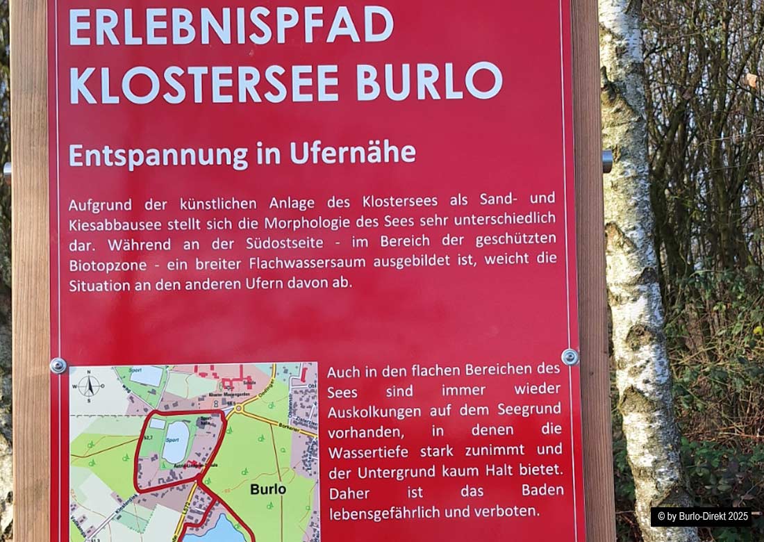 Anm. der Redaktion: An dieser Stelle sei darauf hingewiesen, dass der Pfad in seiner Ausgestaltung weitestgehend naturbelassen wurde (befestigter Schotter und Naturboden) und ist deshalb für Menschen mit Gehbehinderung (Rollstuhl u,ä.) nur sehr eingeschränkt nutzbar (Süd- und Westufer Schotterstrecke, Nord- und Ostufer bis Start- und Endpunkt weitestgehend asphaltierte Wege). Gerne würden wir Eure Meinung dazu erfahren. Schreibt uns unter redaktion@burlo-direkt.de / Stichwort Erlebnispfad.