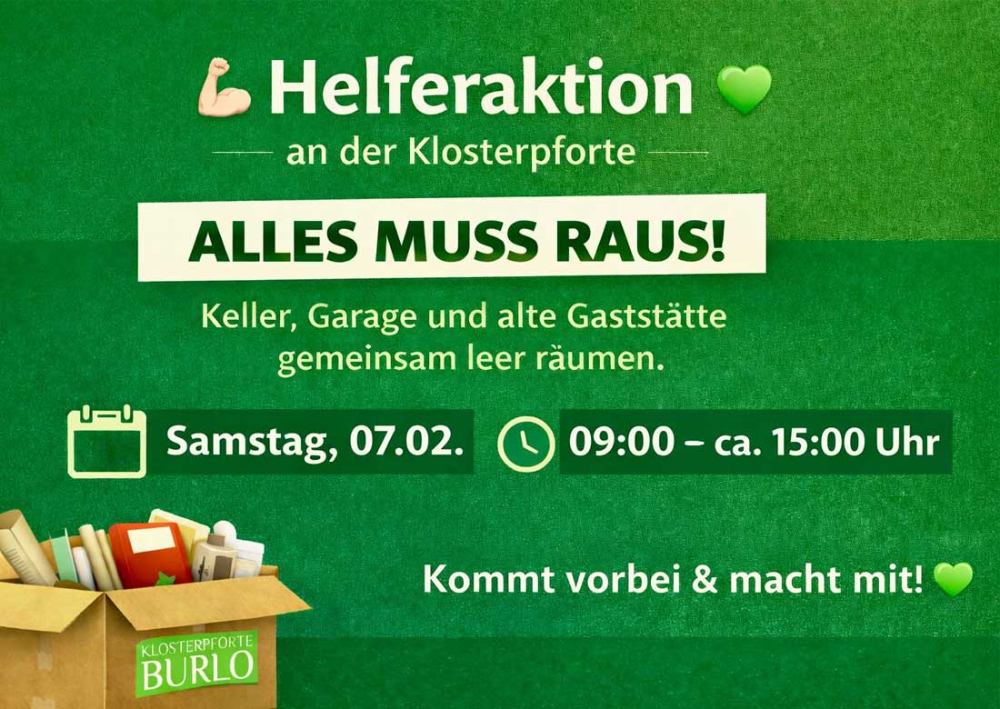 BURLO | pd/bd | Den Winter nutzen, um im Frühling durchzustarten. So kann der Aufruf der Bürgergenossenschaft Klosterpforte verstanden werden, der sich nun an die Genossenschaftsmitglieder sowie die Bürgerinnen und Bürger in Burlo und Borkenwirthe richtet. Am 07. Februar werden möglichst viele helfende Hände benötigt, um für den in Kürze bevorstehenden Baustart die Liegenschaft zu entrümpeln. So sollen der Keller, die Garage sowie der alte Gaststättenbereich leer geräumt werden.