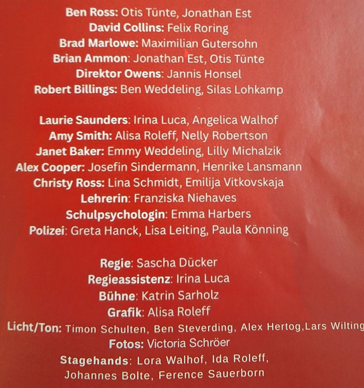 Im Anschluss konnte das Publikum dann miterleben, wie aus den bis dato ganz normalen Verhaltensweisen der Highschool-Jugend eine durch einfache Botschaften, starken Symbolen und emotionaler Sprache geprägte, komplett veränderte Klassengemeinschaft wurde. Die Thematik wurde von allen Beteiligten auf und hinter der Bühne so glaubwürdig und so professionell transportiert, dass das Publikum bis zum letzten Vorhang fasziniert dem Geschehen folgte.