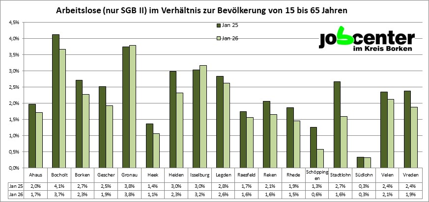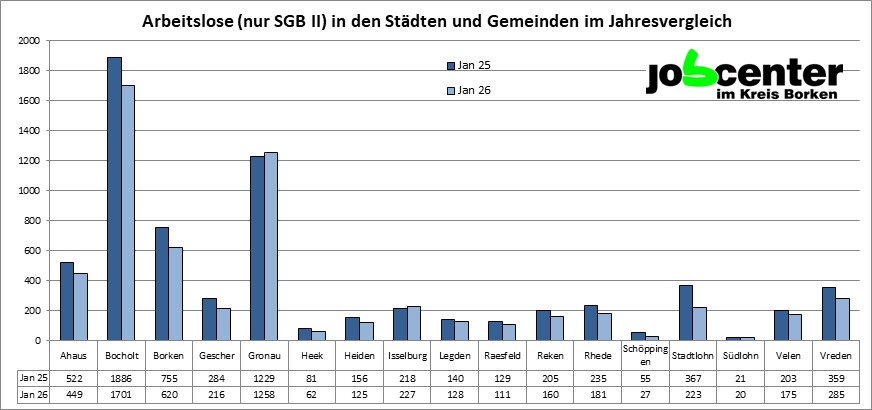 KREIS BORKEN | pd | Die Zahl der SGB-II-Arbeitslosen ist im ersten Monat des Jahres 2026 etwas gestiegen – sie liegt dennoch deutlich unter dem Niveau des Vorjahres. Das teilt Landrat Dr. Kai Zwicker jetzt mit. „Dies ist zu Jahresbeginn keine ungewöhnliche Entwicklung, da die winterliche Witterung erfahrungsgemäß – insbesondere in wetterabhängigen Branchen – zu vorübergehenden Beschäftigungsrückgängen führt“, erläutert er. „Aber auch das Ende des Weihnachtsgeschäftes und zum Jahresende auslaufende befristete Verträge haben Einfluss auf die Entwicklung der Arbeitslosigkeit.“ Das „Jobcenter im Kreis Borken“ weist für den Monat Januar 2026 insgesamt 5.968 erwerbsfähige Leistungsberechtigte aus, die als arbeitslos registriert sind.