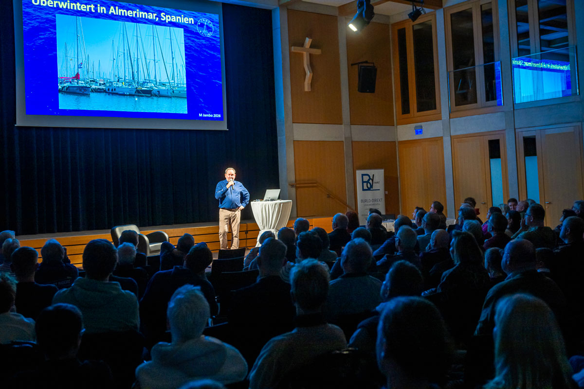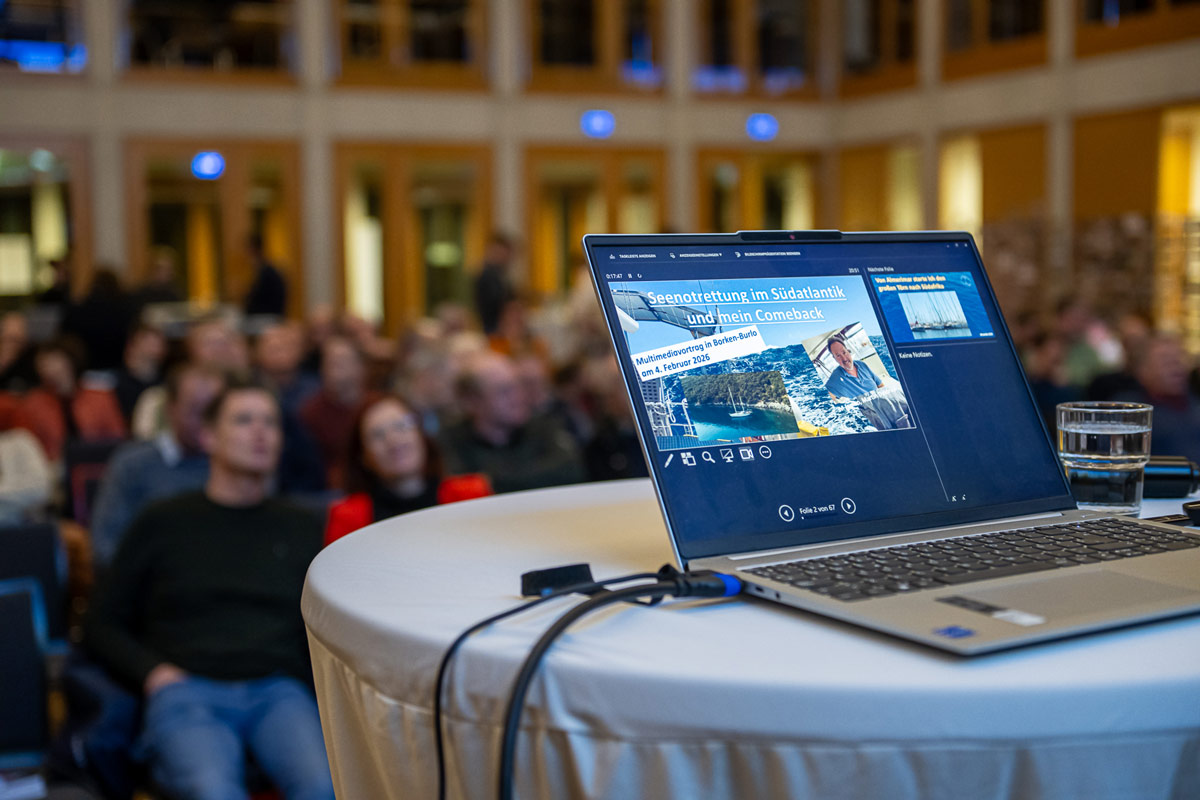 Auch diese vielen Seemeilen wird Daldrup wieder allein an Bord sein, was – so sagt er auf Nachfrage aus dem Publikum – eher eine Entlastung als Belastung sei. „Schließlich trägt man dann, wenn man allein auf den Weltmeeren unterwegs ist, die Verantwortung auch nur für sich selbst und muss sich nicht noch Sorgen um die Gesundheit der Besatzungsmitglieder machen. Dies hat sich zumindest beim Untergang meiner Yacht als sehr hilfreich erwiesen. Ich hatte binnen der wenigen Minuten, die mir verblieben, bis ich in die Rettungsinsel springen und die Seilverbindung zur untergehenden Yacht kappen musste, meinen Rettungsplan im Kopf und dass ich dieses Unglück überleben möchte“, beschreibt er sachlich und eindrucksvoll.