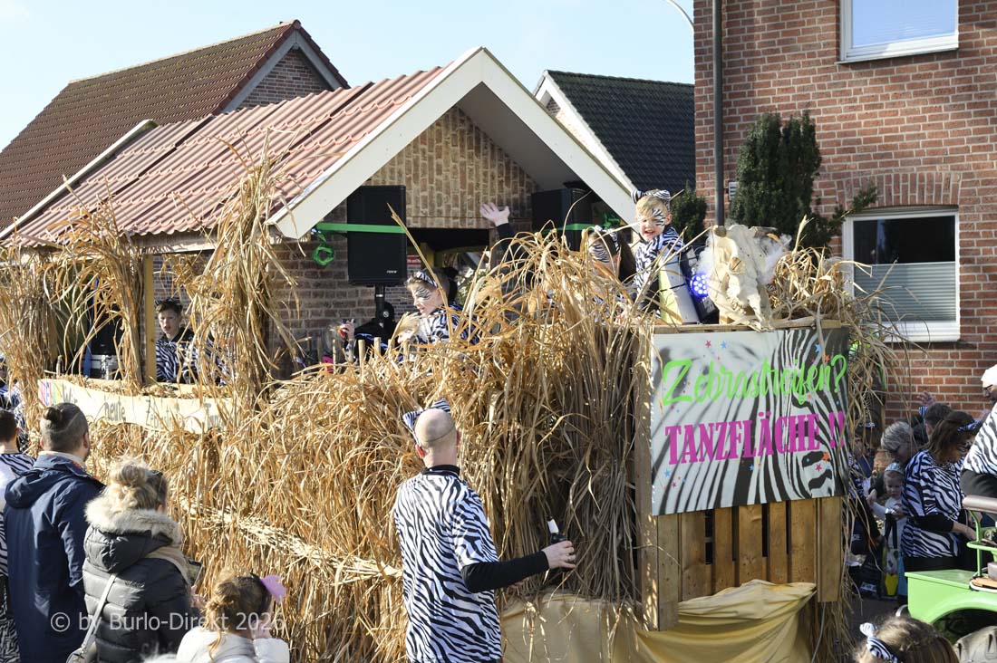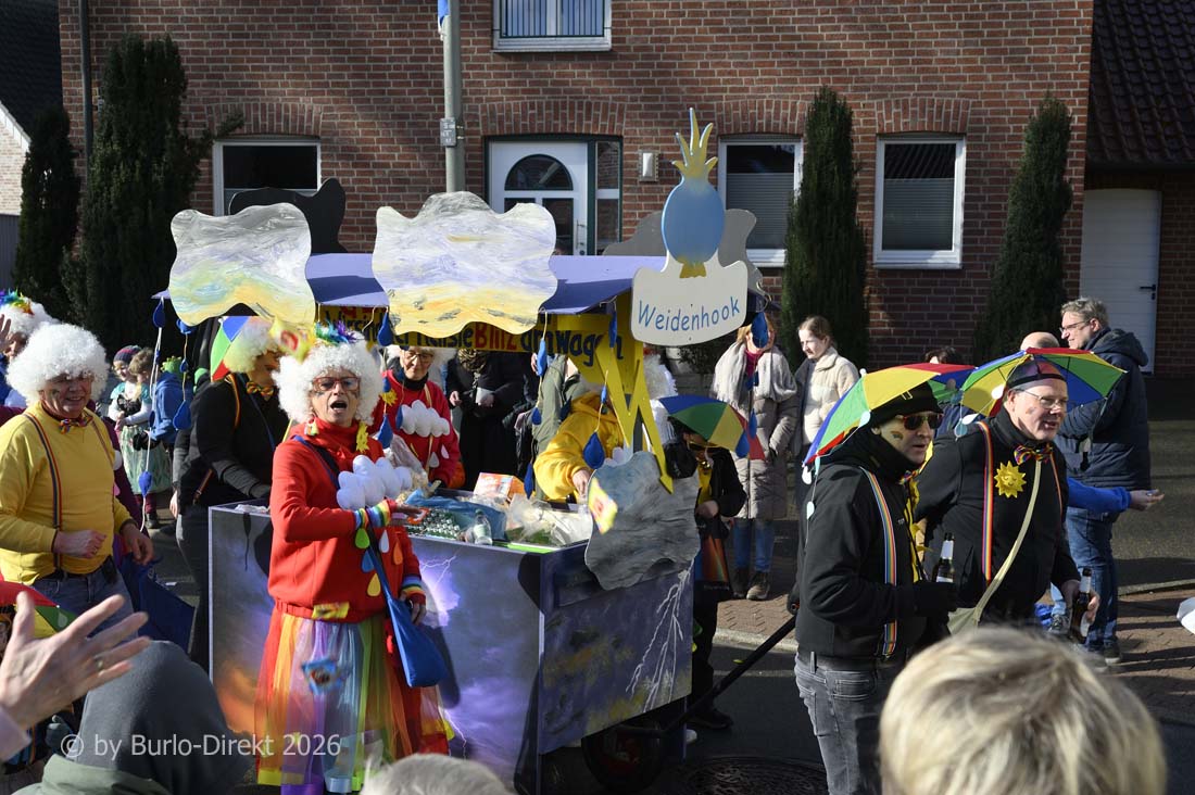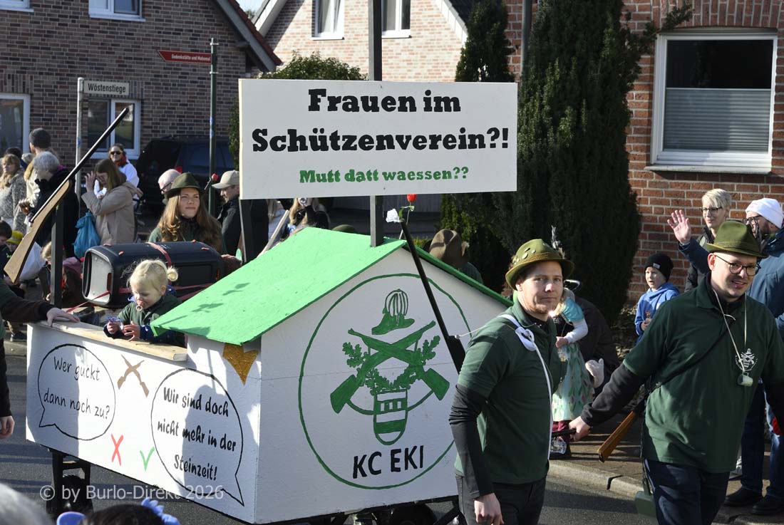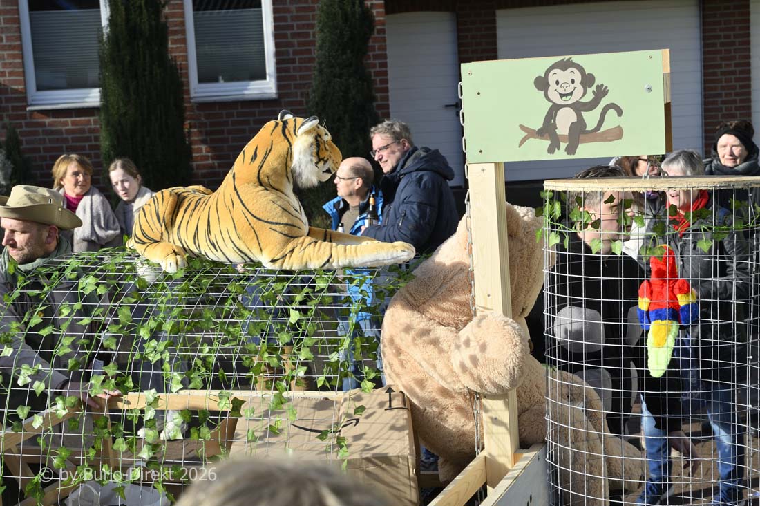 Auch in diesem Jahr hatten sich die Gestalter der Motivwagen wieder einiges einfallen lassen. So wurden der anstehende Bau des Weseker Windparks genauso thematisiert wie die Frage, ob Frauen zukünftig doch im Schützenverein mitregieren könnten. Mit dabei waren auch wieder viele Karnevalsvereine und Gruppen aus den Nachbargemeinden, die sich – wie alle anderen auch – bunt und laut präsentierten. Auch aus den Niederlanden waren diverse Gruppen vertreten.