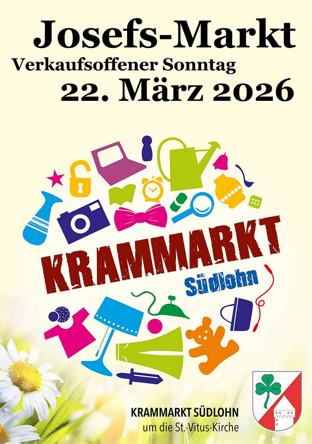 Gleichzeitig wird rund um die St.-Vitus-Kirche der Flohmarkt eröffnet. Große wie kleine Trödler präsentieren ihre Waren – sicher entdeckt man das eine oder andere Schnäppchen. Wer den Winter genutzt hat, Keller oder Kinderzimmer zu entrümpeln und Dinge zu schade zum Wegwerfen waren, kann sie auf dem Flohmarkt anbieten. Private oder gewerbliche Händler melden sich gerne bei Matthias Lüke von der Gemeindeverwaltung unter 02862-58230 oder per E-Mail an matthias.lueke@suedlohn.de. Private Teilnehmer können sich auch am Josefsmarkts-Tag um 9:30 Uhr am Haus Wilmers melden; dort erfolgt die Platzverteilung. Die Teilnahme ist für Privatpersonen kostenlos.