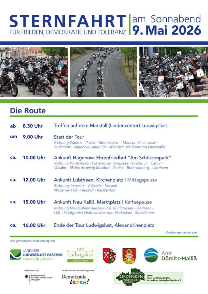 Gestartet wird am 9. Mai vor Ort morgens um 8.30 Uhr am Lindencenter in Ludwigslust. Nach der offiziellen Begrüßung beginnt die Ausfahrt gegen 9 Uhr. Die rund 180 Kilometer lange Tour führt zunächst zur Gedenkstätte des ehemaligen Lagergeländes des KZ Wöbbelin. Dort wird es gegen 10 Uhr den ersten Stopp geben und die Bikerinnen und Biker können Blumen im Gedenken an die Opfer niederlegen. Anschließend geht es nach Lübtheen. Auf dem dortigen Kirchenplatz wird gegen 12 Uhr eine einstündige Mittagspause eingelegt. Im Anschluss daran wird die Fahrt nach Neu Kaliß fortgesetzt. Gegen 15 Uhr gibt es dort eine Kaffeepause. Die Tour endet dann gegen 16 Uhr am Alexandrinenplatz ins Ludwigslust.